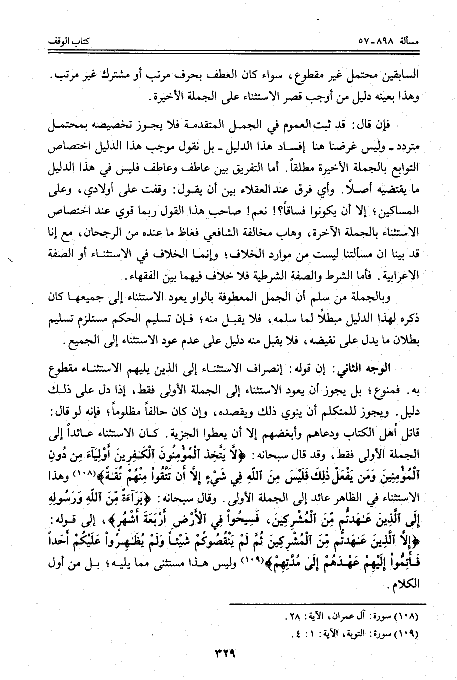 السَّابِقِينَ مُحْتَمَلٌ غَيْرُ مَقْطُوعٍ، سَوَاءٌ كَانَ الْعَطْفُ بِحَرْفٍ مُرَتَّبٍ أَوْ مُشْتَرَكٍ غَيْرِ مُرَتَّبٍ. وَهَذَا بِعَيْنِهِ دَلِيلُ مَنْ أَوْجَبَ قَصْرَ الِاسْتِثْنَاءِ عَلَى الْجُمْلَةِ الْأَخِيرَةِ.
