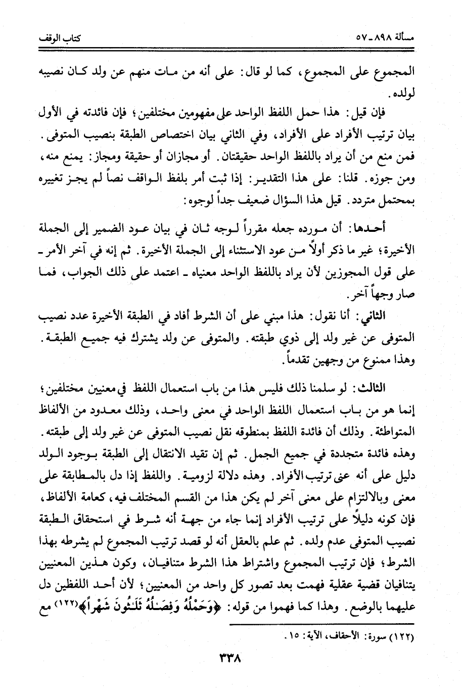 فَإِنْ قِيلَ: هَذَا حَمَلُ اللَّفْظِ الْوَاحِدَ عَلَى مَفْهُومَيْنِ مُخْتَلِفَيْنِ؛ فَإِنَّ فَائِدَتَهُ فِي الْأَوَّلِ بَيَانُ تَرْتِيبِ الْأَفْرَادِ عَلَى الْأَفْرَادِ، وَفِي الثَّانِي بَيَانُ اخْتِصَاصِ الطَّبَقَةِ بِنَصِيبِ الْمُتَوَفَّى. فَمَنْ مَنَعَ مِنْ أَنْ يُرَادَ بِاللَّفْظِ الْوَاحِدِ حَقِيقَتَانِ. أَوْ مَجَازَانِ أَوْ حَقِيقَةٌ وَمَجَازٌ: يَمْنَعُ مِنْهُ، وَمَنْ جَوَّزَهُ. قُلْنَا: عَلَى هَذَا التَّقْدِيرِ: إذَا ثَبَتَ أَمْرٌ بِلَفْظِ الْوَاقِفِ نَصًّا لَمْ يَجُزْ تَغْيِيرُهُ بِمُحْتَمَلٍ مُتَرَدِّدٍ. قِيلَ هَذَا السُّؤَالُ ضَعِيفٌ جِدًّا لِوُجُوهٍ: