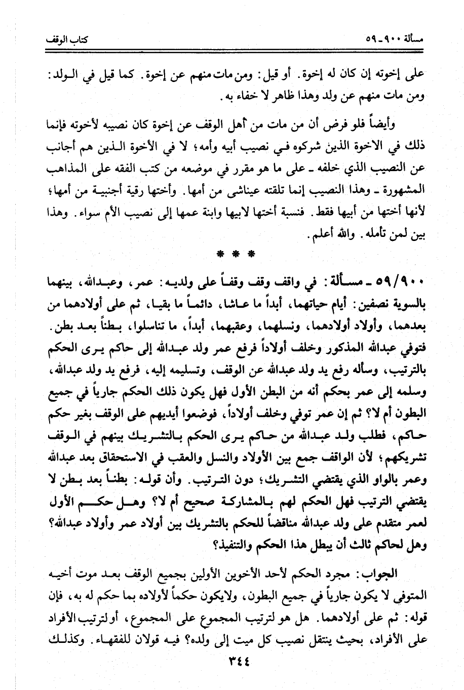 الْجَوَابُ: مُجَرَّدُ الْحُكْمِ لِأَحَدِ الْأَخَوَيْنِ الْأَوَّلَيْنِ بِجَمِيعِ الْوَقْفِ بَعْدَ مَوْتِ أَخِيهِ الْمُتَوَفَّى لَا يَكُونُ جَارِيًا فِي جَمِيعِ الْبُطُونِ، وَلَا يَكُونُ حُكْمًا لِأَوْلَادِهِ بِمَا حَكَمَ لَهُ بِهِ، فَإِنَّ قَوْلَهُ: ثُمَّ عَلَى أَوْلَادِهِمَا. هَلْ هُوَ لِتَرْتِيبِ الْمَجْمُوعِ عَلَى الْمَجْمُوعِ، أَوْ لِتَرْتِيبِ الْأَفْرَادِ عَلَى الْأَفْرَادِ، بِحَيْثُ يَنْتَقِلُ نَصِيبُ كُلِّ مَيِّتٍ إلَى وَلَدِهِ؟ فِيهِ قَوْلَانِ لِلْفُقَهَاءِ.