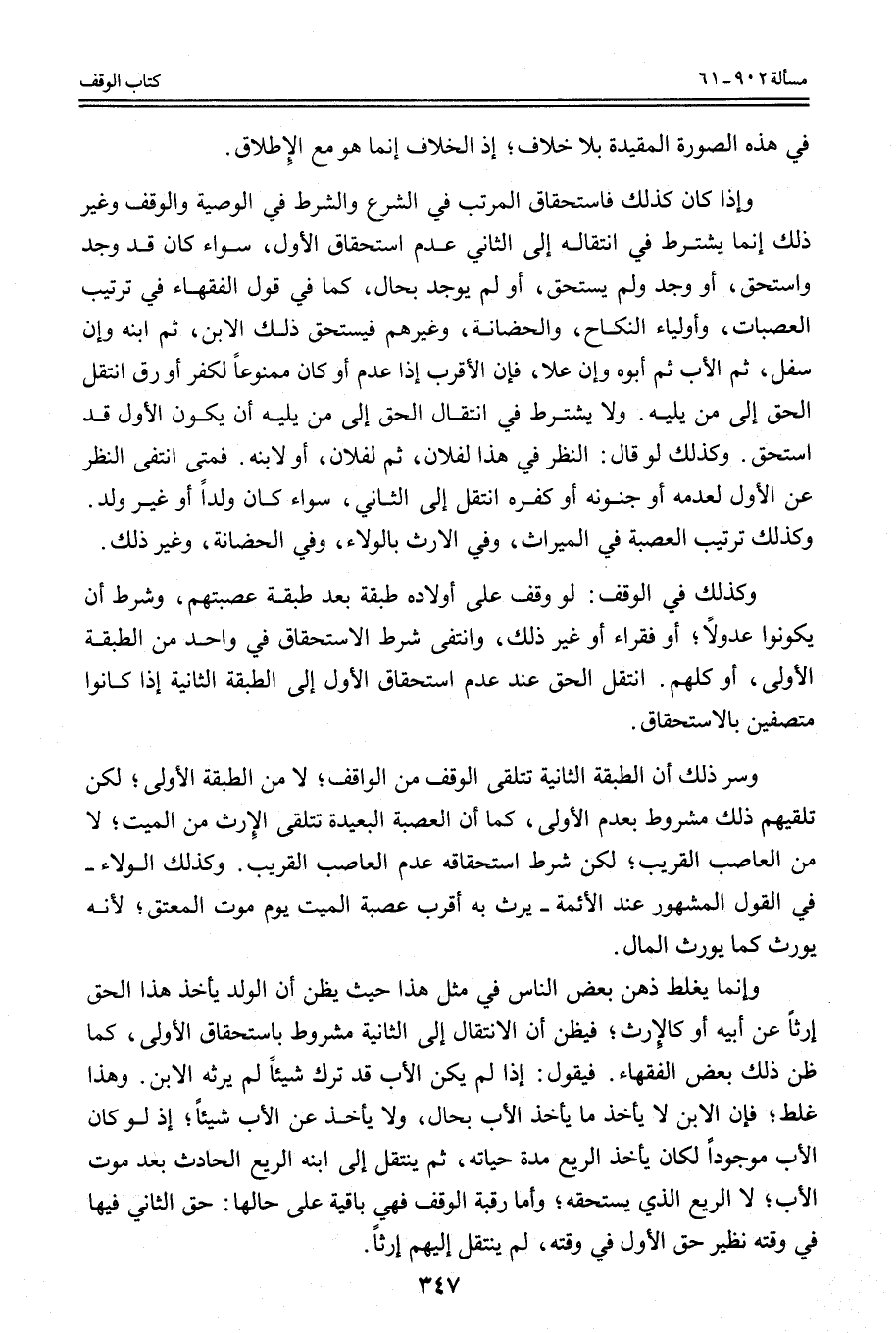 وَسِرُّ ذَلِكَ أَنَّ الطَّبَقَةَ الثَّانِيَةَ تَتَلَقَّى الْوَقْفَ مِنْ الْوَاقِفِ؛ لَا مِنْ الطَّبَقَةِ الْأُولَى؛ لَكِنَّ تَلَقِّيهمْ ذَلِكَ مَشْرُوطٌ بِعَدَمِ الْأُولَى، كَمَا أَنَّ الْعَصَبَةَ الْبَعِيدَةَ تَتَلَقَّى الْإِرْثَ مِنْ الْمَيِّتِ؛ لَا مِنْ الْعَاصِبِ الْقَرِيبِ؛ لَكِنَّ شَرْطَ اسْتِحْقَاقِهِ عَدَمُ الْعَاصِبِ الْقَرِيبِ. وَكَذَلِكَ الْوَلَاءُ - فِي الْقَوْلِ الْمَشْهُورِ عِنْدَ الْأَئِمَّةِ - يَرِثُ بِهِ أَقْرَبُ عَصَبَةِ الْمَيِّتِ يَوْمَ مَوْتِ الْمُعْتِقِ؛ لِأَنَّهُ يُورَثُ كَمَا يُورَثُ الْمَالُ.