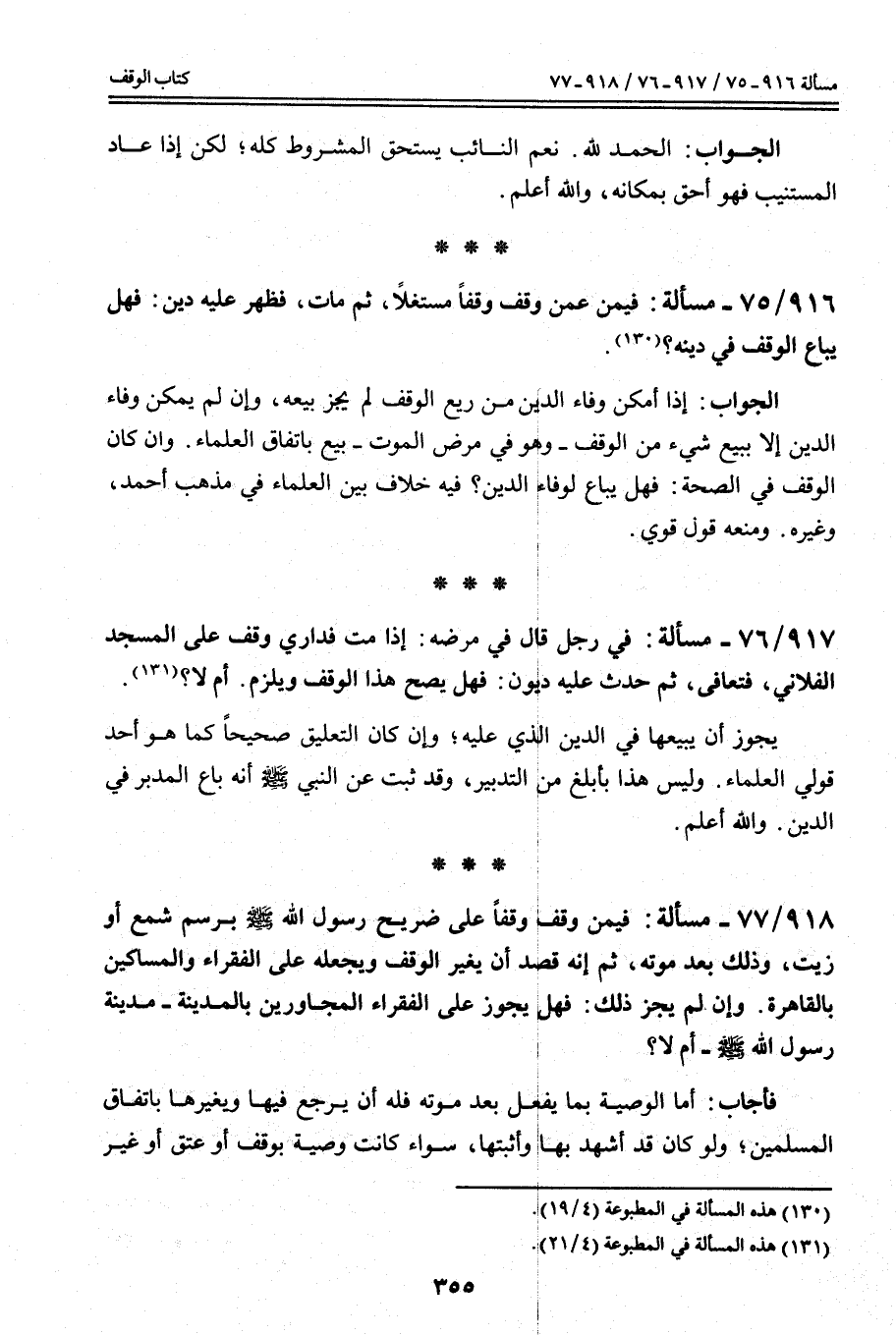 فِيمَنْ وَقَفَ وَقْفًا عَلَى ضَرِيحِ رَسُولِ اللَّهِ - صَلَّى اللَّهُ عَلَيْهِ وَسَلَّمَ - بِرَسْمِ شَمْعٍ أَوْ زَيْتٍ، وَذَلِكَ بَعْدَ مَوْتِهِ، ثُمَّ إنَّهُ قَصَدَ أَنْ يُغَيِّرَ الْوَقْفَ وَيَجْعَلَهُ عَلَى الْفُقَرَاءِ وَالْمَسَاكِينِ بِالْقَاهِرَةِ. وَإِنْ لَمْ يَجُزْ ذَلِكَ: فَهَلْ يَجُوزُ عَلَى الْفُقَرَاءِ الْمُجَاوِرِينَ بِالْمَدِينَةِ - مَدِينَةِ رَسُولِ اللَّهِ - صَلَّى اللَّهُ عَلَيْهِ وَسَلَّمَ - أَمْ لَا؟ فَأَجَابَ: أَمَّا الْوَصِيَّةُ بِمَا يُفْعَلُ بَعْدَ مَوْتِهِ فَلَهُ أَنْ يَرْجِعَ فِيهَا وَيُغَيِّرَهَا بِاتِّفَاقِ الْمُسْلِمِينَ؛ وَلَوْ كَانَ قَدْ أَشْهَدَ بِهَا وَأَثْبَتَهَا، سَوَاءٌ كَانَتْ وَصِيَّةً بِوَقْفٍ أَوْ عِتْقٍ أَوْ غَيْرِ