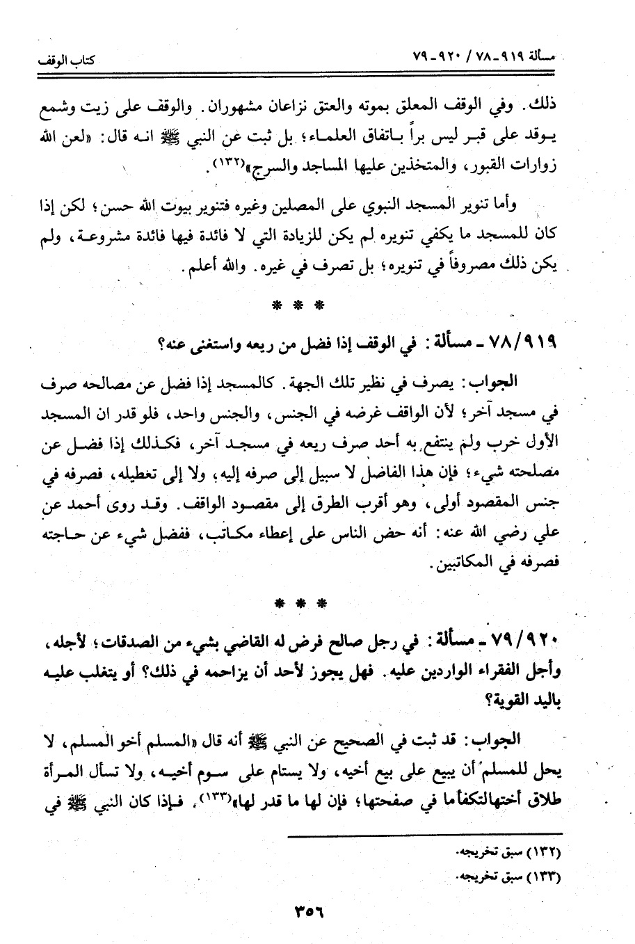 الْجَوَابُ: يُصْرَفُ فِي نَظِيرِ تِلْكَ الْجِهَةِ كَالْمَسْجِدِ إذَا فَضَلَ عَنْ مَصَالِحِهِ صُرِفَ فِي مَسْجِدٍ آخَرَ؛ لِأَنَّ الْوَاقِفَ غَرَضُهُ فِي الْجِنْسِ، وَالْجِنْسُ وَاحِدٌ، فَلَوْ قُدِّرَ أَنَّ الْمَسْجِدَ الْأَوَّلَ خَرِبَ وَلَمْ يَنْتَفِعْ بِهِ أَحَدٌ صُرِفَ رِيعُهُ فِي مَسْجِدٍ آخَرَ، فَكَذَلِكَ إذَا فَضَلَ عَنْ مَصْلَحَتِهِ شَيْءٌ؛ فَإِنَّ هَذَا الْفَاضِلَ لَا سَبِيلَ إلَى صَرْفِهِ إلَيْهِ؛ وَلَا إلَى تَعْطِيلِهِ، فَصَرْفُهُ فِي جِنْسِ الْمَقْصُودِ أَوْلَى، وَهُوَ أَقْرَبُ الطُّرُقِ إلَى مَقْصُودِ الْوَاقِفِ. وَقَدْ رَوَى أَحْمَدُ عَنْ عَلِيٍّ - رَضِيَ اللَّهُ عَنْهُ -: أَنَّهُ حَضَّ النَّاسَ عَلَى إعْطَاءِ مُكَاتَبٍ، فَفَضَلَ شَيْءٌ عَنْ حَاجَتِهِ فَصَرَفَهُ فِي الْمُكَاتَبِينَ.