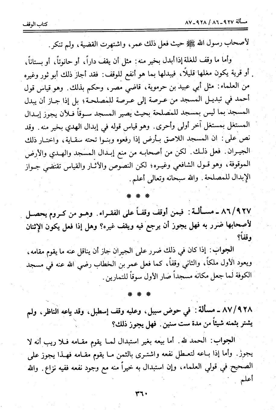 الْجَوَابُ: الْحَمْدُ لِلَّهِ. أَمَّا بَيْعُهُ بِغَيْرِ اسْتِبْدَالٍ لِمَا يَقُومُ مَقَامَهُ فَلَا رَيْبَ أَنَّهُ لَا يَجُوزُ. وَأَمَّا إذَا بَاعَهُ لِتَعَطُّلِ نَفْعِهِ وَاشْتَرَى بِالثَّمَنِ مَا يَقُومُ مَقَامَهُ فَهَذَا يَجُوزُ عَلَى الصَّحِيحِ فِي قَوْلَيْ الْعُلَمَاءِ، وَإِنْ اسْتَبْدَلَ بِهِ خَيْرًا مِنْهُ مَعَ وُجُودِ نَفْعِهِ فَفِيهِ نِزَاعٌ. وَاَللَّهُ أَعْلَمُ.