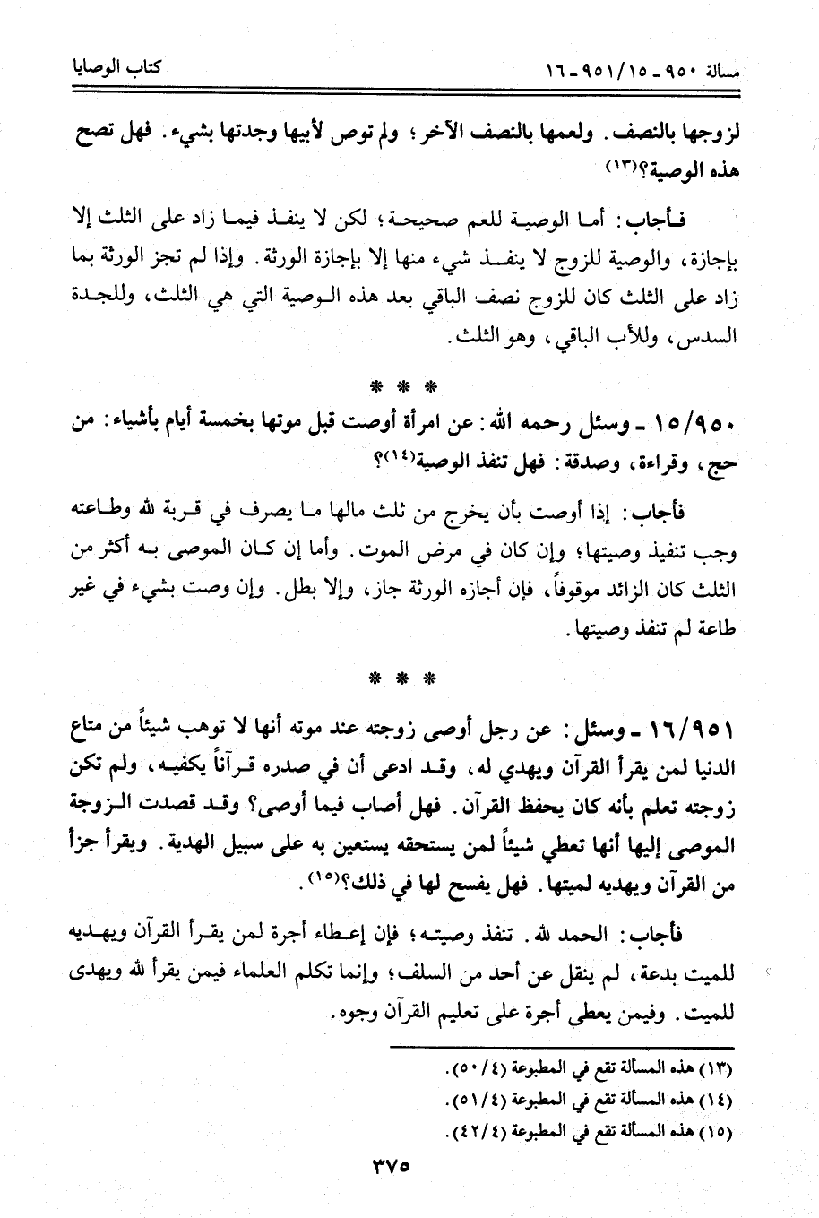 951 - 16 وَسُئِلَ: عَنْ رَجُلٍ أَوْصَى زَوْجَتَهُ عِنْدَ مَوْتِهِ أَنَّهَا لَا تُوهِبُ شَيْئًا مِنْ مَتَاعِ الدُّنْيَا لِمَنْ يَقْرَأُ الْقُرْآنَ وَيُهْدِي لَهُ، وَقَدْ ادَّعَى أَنَّ فِي صَدْرِهِ قُرْآنًا يَكْفِيهِ، وَلَمْ تَكُنْ زَوْجَتُهُ تَعْلَمُ بِأَنَّهُ كَانَ يَحْفَظُ الْقُرْآنَ. فَهَلْ أَصَابَ فِيمَا أَوْصَى؟ وَقَدْ قَصَدَتْ الزَّوْجَةُ الْمُوصَى إلَيْهَا أَنَّهَا تُعْطِي شَيْئًا لِمَنْ يَسْتَحِقُّهُ يَسْتَعِينُ بِهِ عَلَى سَبِيلِ الْهَدِيَّةِ. وَيَقْرَأُ جُزْءًا مِنْ الْقُرْآنِ وَيُهْدِيهِ لِمَيِّتِهَا. فَهَلْ يُفْسَحُ لَهَا فِي ذَلِكَ؟ .