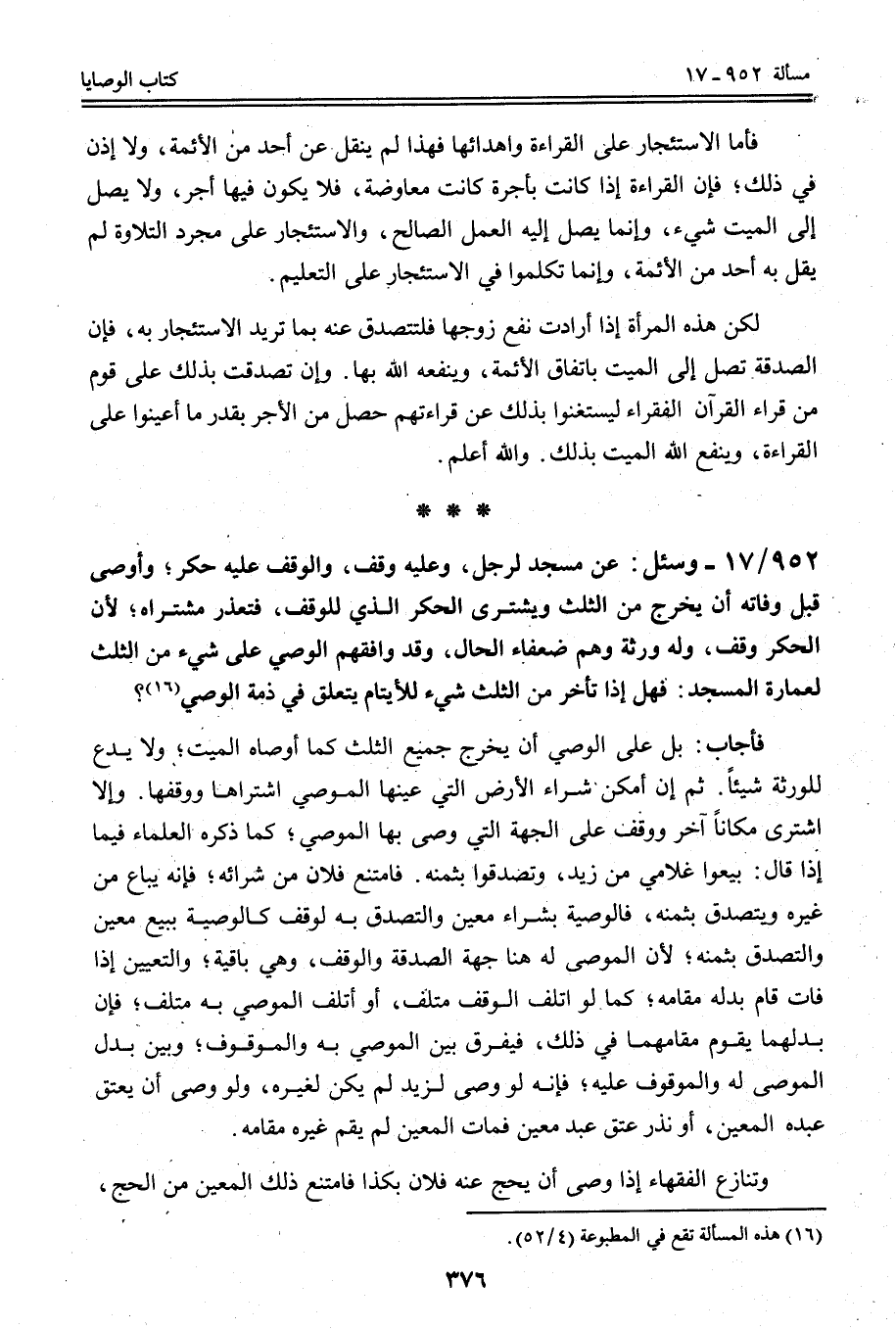 952 - 17 وَسُئِلَ: عَنْ مَسْجِدٍ لِرَجُلٍ، وَعَلَيْهِ وَقْفٌ، وَالْوَقْفُ عَلَيْهِ حِكْرٌ؛ وَأَوْصَى قَبْلَ وَفَاتِهِ أَنْ يُخْرَجَ مِنْ الثُّلُثِ وَيُشْتَرَى الْحِكْرُ الَّذِي لِلْوَقْفِ، فَتَعَذَّرَ مُشْتَرَاهُ؛ لِأَنَّ الْحِكْرَ وَقْفٌ، وَلَهُ وَرَثَةٌ وَهُمْ ضُعَفَاءُ الْحَالِ، وَقَدْ وَافَقَهُمْ الْوَصِيُّ عَلَى شَيْءٍ مِنْ الثُّلُثِ لِعِمَارَةِ الْمَسْجِدِ: فَهَلْ إذَا تَأَخَّرَ مِنْ الثُّلُثِ شَيْءٌ لِلْأَيْتَامِ يَتَعَلَّقُ فِي ذِمَّةِ الْوَصِيِّ؟