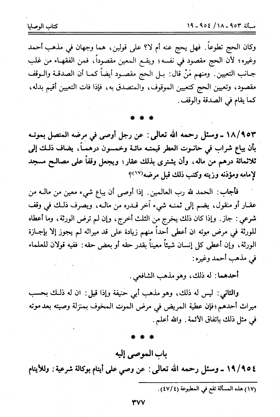 953 - 18 وَسُئِلَ - رَحِمَهُ اللَّهُ تَعَالَى -: عَنْ رَجُلٍ أَوْصَى فِي مَرَضِهِ الْمُتَّصِلِ بِمَوْتِهِ بِأَنْ يُبَاعَ شَرَابٌ فِي حَانُوتِ الْعِطْرِ قِيمَتُهُ مِائَةٌ وَخَمْسُونَ دِرْهَمًا، مُضَافٌ ذَلِكَ إلَى ثَلَاثِمِائَةِ دِرْهَمٍ مِنْ مَالِهِ، وَأَنْ يُشْتَرَى بِذَلِكَ عَقَارٌ؛ وَيُجْعَلَ وَقْفًا عَلَى مَصَالِحِ مَسْجِدٍ لِإِمَامِهِ وَمُؤَذِّنِهِ وَزَيْتِهِ وَكَتَبَ ذَلِكَ قَبْلَ مَرَضِهِ؟ فَأَجَابَ: الْحَمْدُ لِلَّهِ رَبِّ الْعَالَمِينَ. إذَا أَوْصَى أَنْ يُبَاعَ شَيْءٌ مُعِينٌ مِنْ مَالِهِ مِنْ عَقَارٍ أَوْ مَنْقُولٍ، يُضَمُّ إلَى ثَمَنِهِ شَيْءٌ آخَرُ قَدْره مِنْ مَالِهِ، وَيُصْرَفُ ذَلِكَ فِي وَقْفٍ شَرْعِيٍّ: جَازَ.