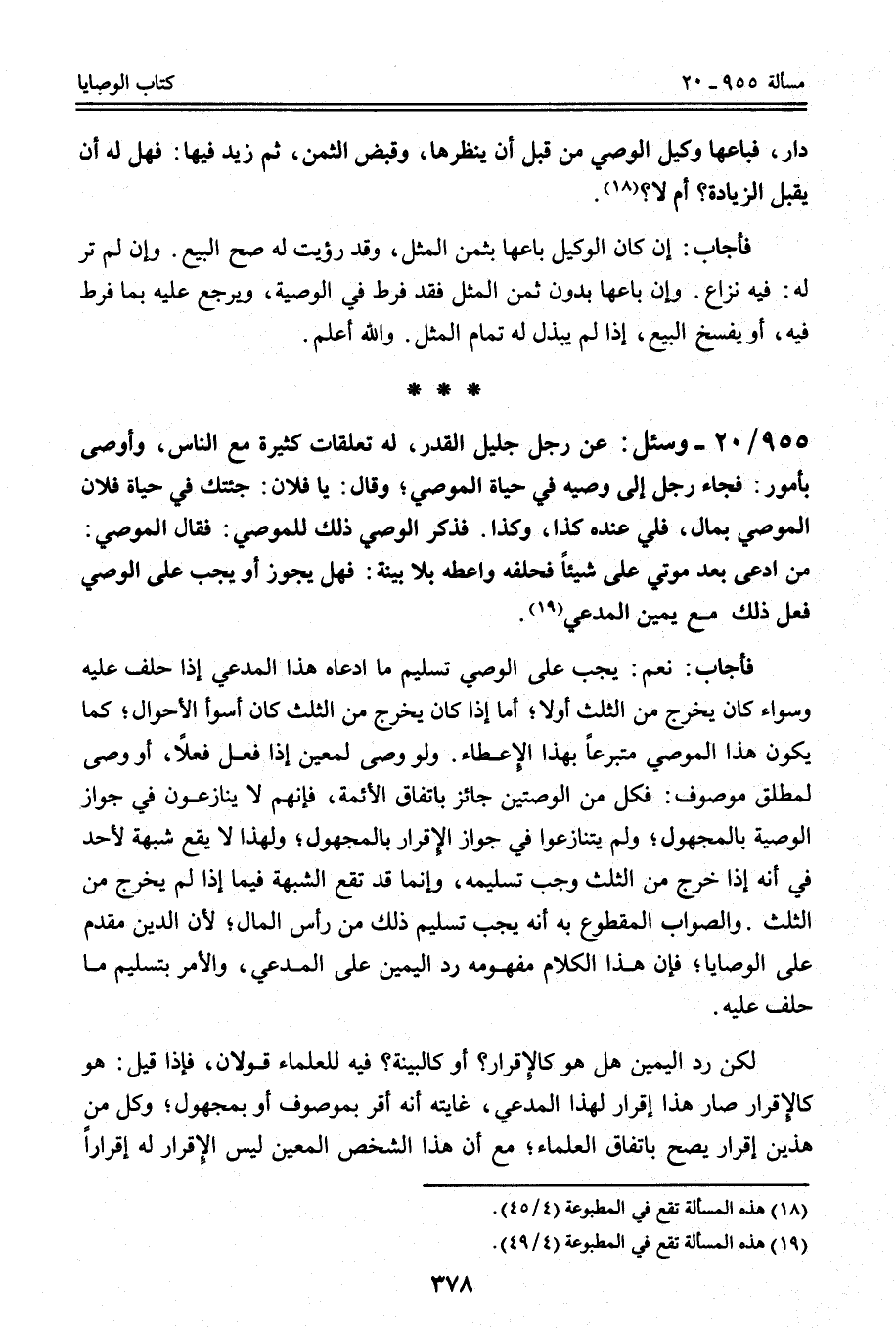 955 - 20 وَسُئِلَ: عَنْ رَجُلٍ جَلِيلِ الْقَدْرِ، لَهُ تَعَلُّقَاتٌ كَثِيرَةٌ مَعَ النَّاسِ، وَأَوْصَى بِأُمُورٍ: فَجَاءَ رَجُلٌ إلَى وَصِيِّهِ فِي حَيَاةِ الْمُوصِي؛ وَقَالَ: يَا فُلَانٌ: جِئْتُك فِي حَيَاةِ فُلَانٍ الْمُوصِي بِمَالٍ، فَلِي عِنْدَهُ كَذَا، وَكَذَا. فَذَكَرَ الْوَصِيُّ ذَلِكَ لِلْمُوصِي: فَقَالَ الْمُوصِي: مَنْ ادَّعَى بَعْدَ مَوْتِي عَلَيَّ شَيْئًا فَحَلِّفْهُ وَأَعْطِهِ بِلَا بَيِّنَةٍ: فَهَلْ يَجُوزُ أَوْ يَجِبُ عَلَى الْوَصِيِّ فِعْلُ ذَلِكَ مَعَ يَمِينِ الْمُدَّعِي.