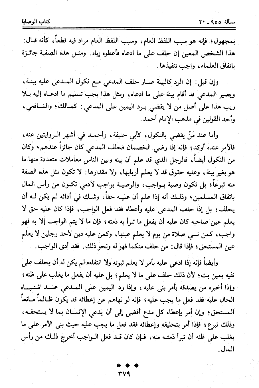وَأَمَّا عِنْدَ مَنْ يَقْضِي بِالنُّكُولِ، كَأَبِي حَنِيفَةَ، وَأَحْمَدَ فِي أَشْهَرِ الرِّوَايَتَيْنِ عَنْهُ، فَالْأَمْرُ عِنْدَهُ أَوْكَدُ؛ فَإِنَّهُ إذَا رَضِيَ الْخَصْمَانِ فَحَلَفَ الْمُدَّعِي كَانَ جَائِزًا عِنْدَهُمْ؛ وَكَانَ مِنْ النُّكُولِ أَيْضًا، فَالرَّجُلُ الَّذِي قَدْ عُلِمَ أَنَّ بَيْنَهُ وَبَيْنَ النَّاسِ مُعَامَلَاتٍ مُتَعَدِّدَةً مِنْهَا مَا هُوَ بِغَيْرِ بَيِّنَةٍ، وَعَلَيْهِ حُقُوقٌ قَدْ لَا يُعْلَمُ أَرْبَابُهَا، وَلَا مِقْدَارُهَا: لَا تَكُونُ مِثْلُ هَذِهِ الصِّفَةِ مِنْهُ تَبَرُّعًا؛ بَلْ تَكُونُ وَصِيَّةً بِوَاجِبٍ، وَالْوَصِيَّةُ بِوَاجِبٍ لِآدَمِيٍّ تَكُونُ مِنْ رَأْسِ الْمَالِ بِاتِّفَاقِ الْمُسْلِمِينَ؛ وَذَلِكَ أَنَّهُ إذَا عُلِمَ أَنَّ عَلَيْهِ حَقًّا، وَشُكَّ فِي أَدَائِهِ لَمْ يَكُنْ لَهُ أَنْ يَحْلِفَ؛ بَلْ إذَا حَلَفَ الْمُدَّعَى عَلَيْهِ وَأَعْطَاهُ فَقَدْ فَعَلَ الْوَاجِبَ، فَإِذَا كَانَ عَلَيْهِ حَقٌّ لَا يُعْلَمُ عَيْنُ صَاحِبِهِ كَانَ عَلَيْهِ أَنْ يَفْعَلَ مَا تَبْرَأَ بِهِ ذِمَّتُهُ؛ فَإِنَّ مَا لَا يَتِمُّ الْوَاجِبُ إلَّا بِهِ فَهُوَ وَاجِبٌ، كَمَنْ نَسِيَ صَلَاةً مِنْ يَوْمٍ لَا يَعْلَمُ عَيْنَهَا، وَكَمَنْ عَلَيْهِ دَيْنٌ لِأَحَدِ رَجُلَيْنِ لَا يَعْلَمُ عَيْنَ الْمُسْتَحَقِّ؛ فَإِذَا قَالَ: مَنْ حَلَفَ مِنْكُمَا فَهُوَ لَهُ وَنَحْوُ ذَلِكَ. فَقَدْ أَدَّى الْوَاجِبَ.