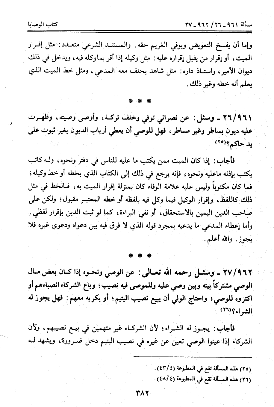 961 - 26 وَسُئِلَ: عَنْ نَصْرَانِيٍّ تُوُفِّيَ وَخَلَفَ تَرِكَةً، وَأَوْصَى وَصِيَّتَهُ، وَظَهَرَتْ عَلَيْهِ دُيُونٌ بِسَاطِرِ وَغَيْرِ مَسَاطِر، فَهَلْ لِلْوَصِيِّ أَنْ يُعْطِيَ أَرْبَابَ الدُّيُونِ بِغَيْرِ ثُبُوتٍ عَلَى يَدِ حَاكِمٍ؟