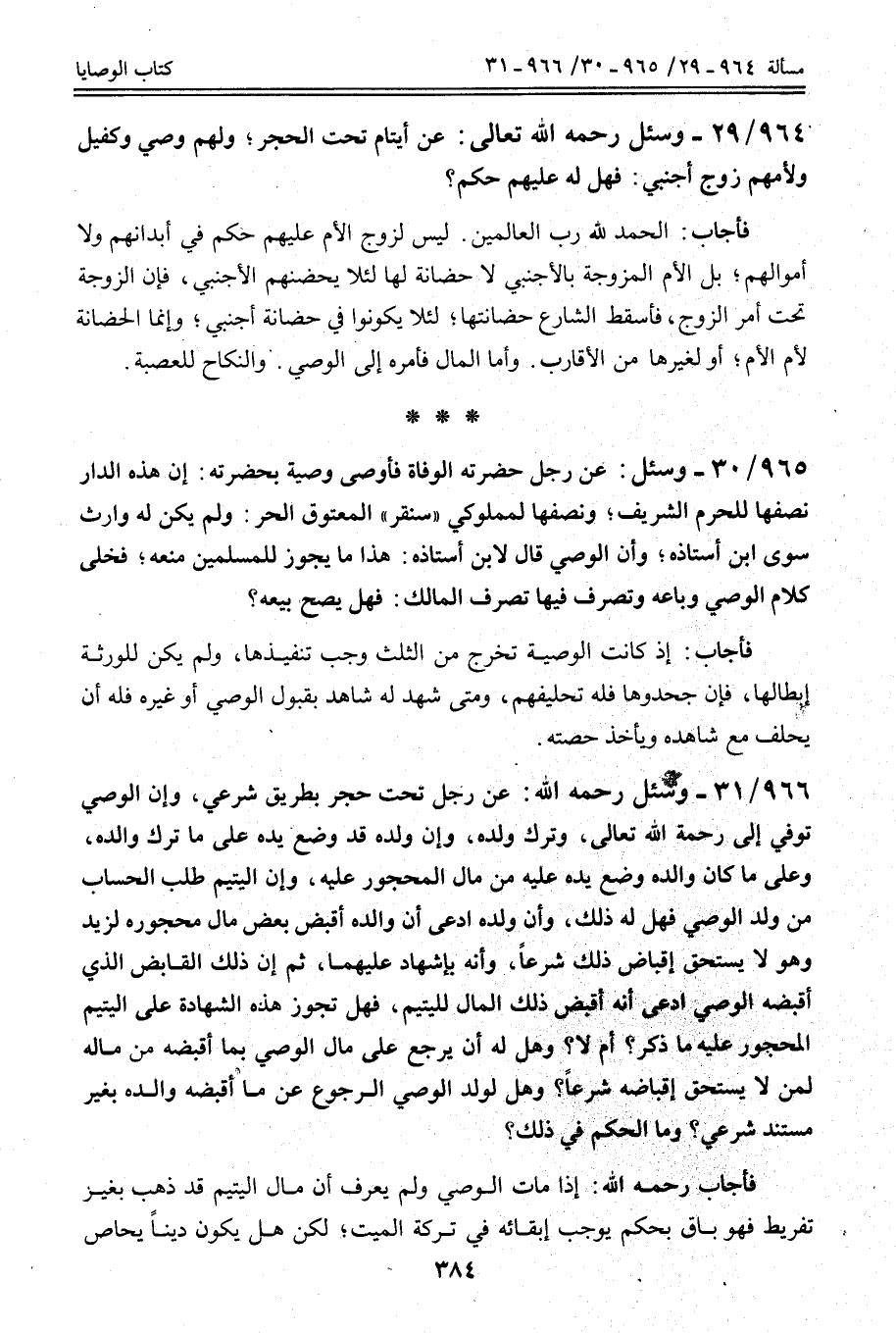 965 - 30 وَسُئِلَ: عَنْ رَجُلٍ حَضَرَتْهُ الْوَفَاةُ فَأَوْصَى وَصِيَّةً بِحَضْرَتِهِ: إنَّ هَذِهِ الدَّارَ نِصْفُهَا لِلْحَرَمِ الشَّرِيفِ؛ وَنِصْفُهَا لِمَمْلُوكِيٍّ " سُنْقُرٍ " الْمَعْتُوقِ الْحُرِّ: وَلَمْ يَكُنْ لَهُ وَارِثٌ سِوَى ابْنِ أُسْتَاذِهِ؛ وَأَنَّ الْوَصِيَّ قَالَ لِابْنِ أُسْتَاذِهِ: هَذَا مَا يَجُوزُ لِلْمُسْلِمِينَ مَنْعُهُ؛ فَخَلَّى كَلَامَ الْوَصِيِّ وَبَاعَهُ وَتَصَرَّفَ فِيهَا تَصَرُّفَ الْمَالِكِ: فَهَلْ يَصِحُّ بَيْعُهُ؟