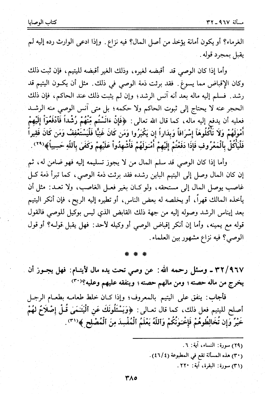 967 - 32 وَسُئِلَ - رَحِمَهُ اللَّهُ -: عَنْ وَصِيٍّ تَحْتَ يَدِهِ مَالٌ لِأَيْتَامٍ: فَهَلْ يَجُوزُ أَنْ يُخْرِجَ مِنْ مَالِهِ حِصَّتَهُ؛ وَمِنْ مَالِهِمْ حِصَّتَهُ؛ وَيُنْفِقَهُ عَلَيْهِمْ وَعَلَيْهِ؟