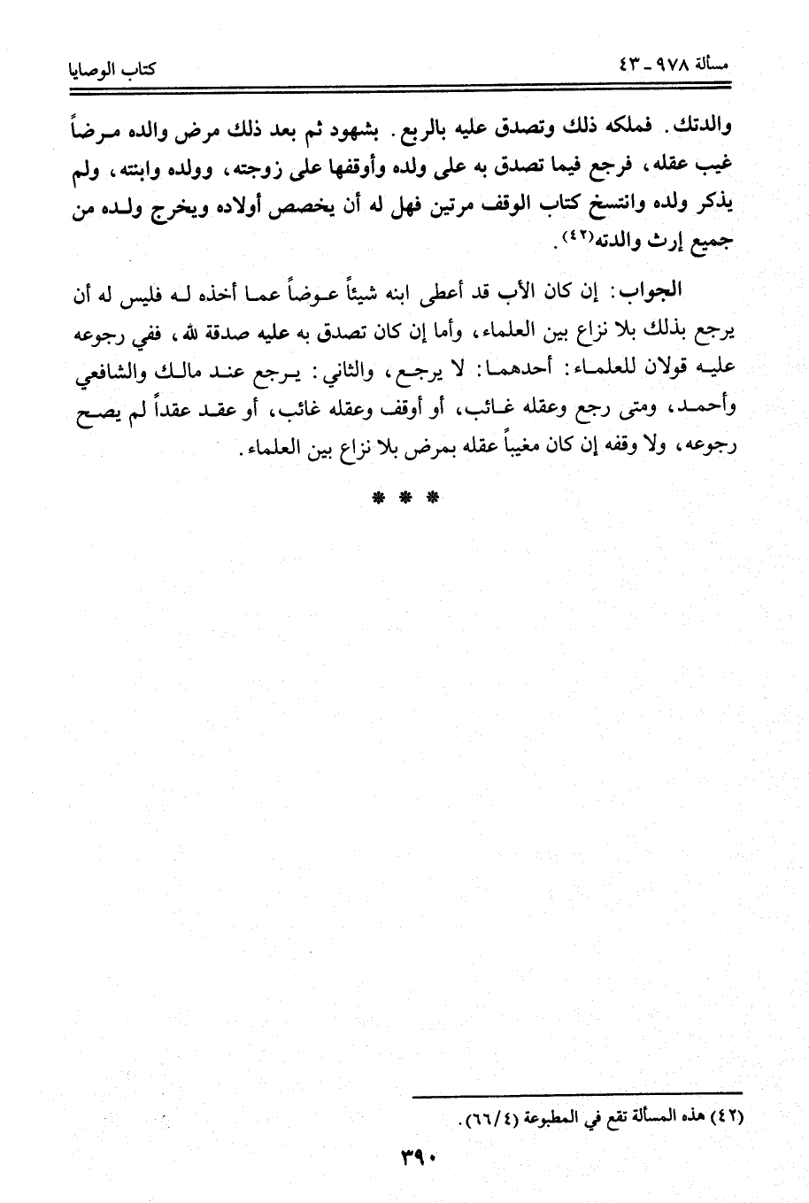 الْجَوَابُ: إنْ كَانَ الْأَبُ قَدْ أَعْطَى ابْنَهُ شَيْئًا عِوَضًا عَمَّا أَخَذَهُ لَهُ فَلَيْسَ لَهُ أَنْ يَرْجِعَ بِذَلِكَ بِلَا نِزَاعٍ بَيْنَ الْعُلَمَاءِ، وَأَمَّا إنْ كَانَ تَصَدَّقَ بِهِ عَلَيْهِ صَدَقَةً لِلَّهِ، فَفِي رُجُوعِهِ عَلَيْهِ قَوْلَانِ لِلْعُلَمَاءِ: أَحَدُهُمَا: لَا يَرْجِعُ، وَالثَّانِي: يَرْجِعُ عِنْدَ مَالِكٍ وَالشَّافِعِيِّ وَأَحْمَدَ، وَمَتَى رَجَعَ وَعَقْلُهُ غَائِبٌ، أَوْ أَوْقَفَ وَعَقْلُهُ غَائِبٌ، أَوْ عَقَدَ عَقْدًا لَمْ يَصِحَّ رُجُوعُهُ وَلَا وَقْفُهُ إنْ كَانَ مَغِيبًا عَقْلُهُ بِمَرَضٍ بِلَا نِزَاعٍ بَيْنَ الْعُلَمَاءِ.
