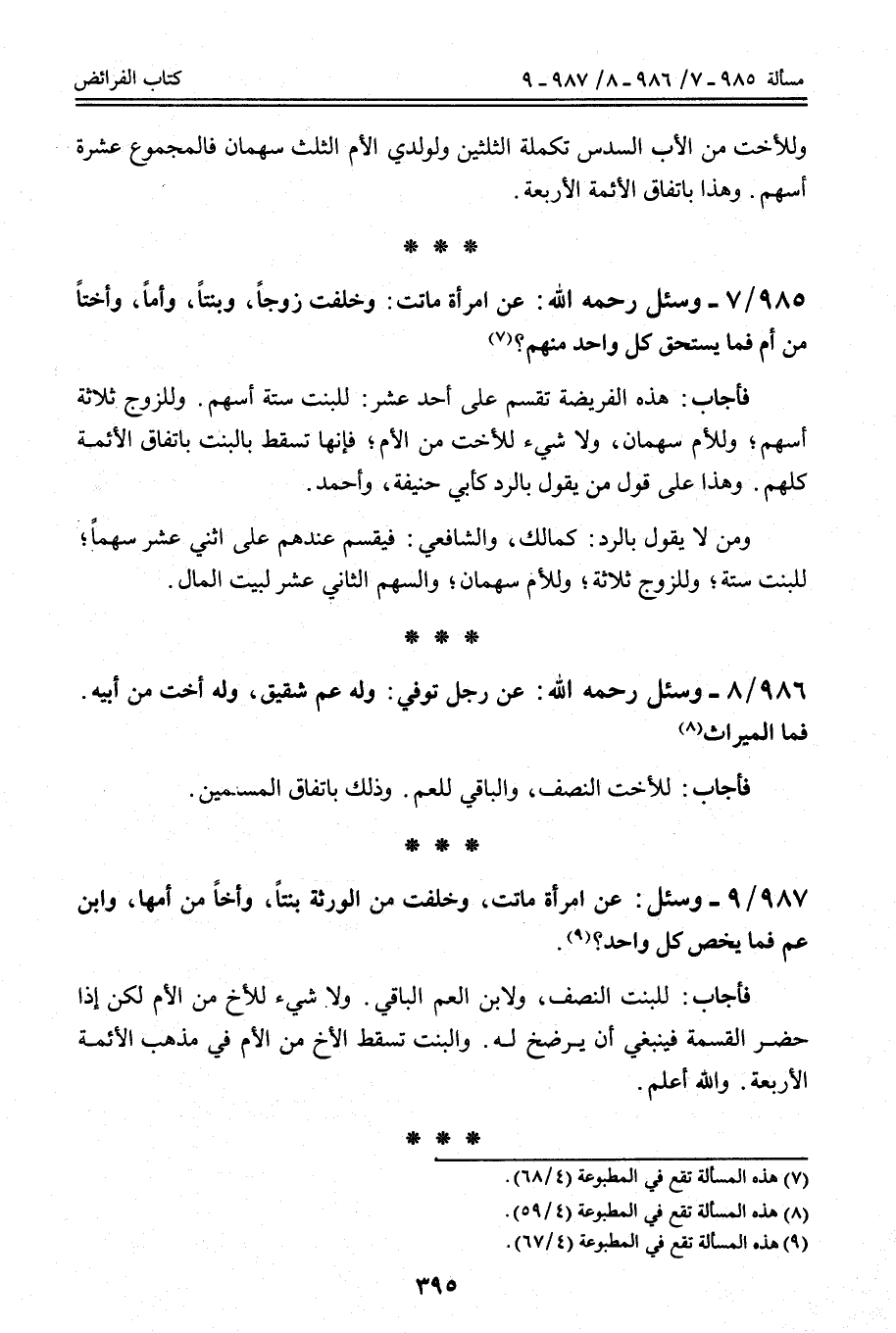 987 - 9 وَسُئِلَ: عَنْ امْرَأَةٍ مَاتَتْ، وَخَلَفَتْ مِنْ الْوَرَثَةِ بِنْتًا، وَأَخًا مِنْ أُمِّهَا، وَابْنِ عَمٍّ فَمَا يَخُصُّ كُلَّ وَاحِدٍ؟ .