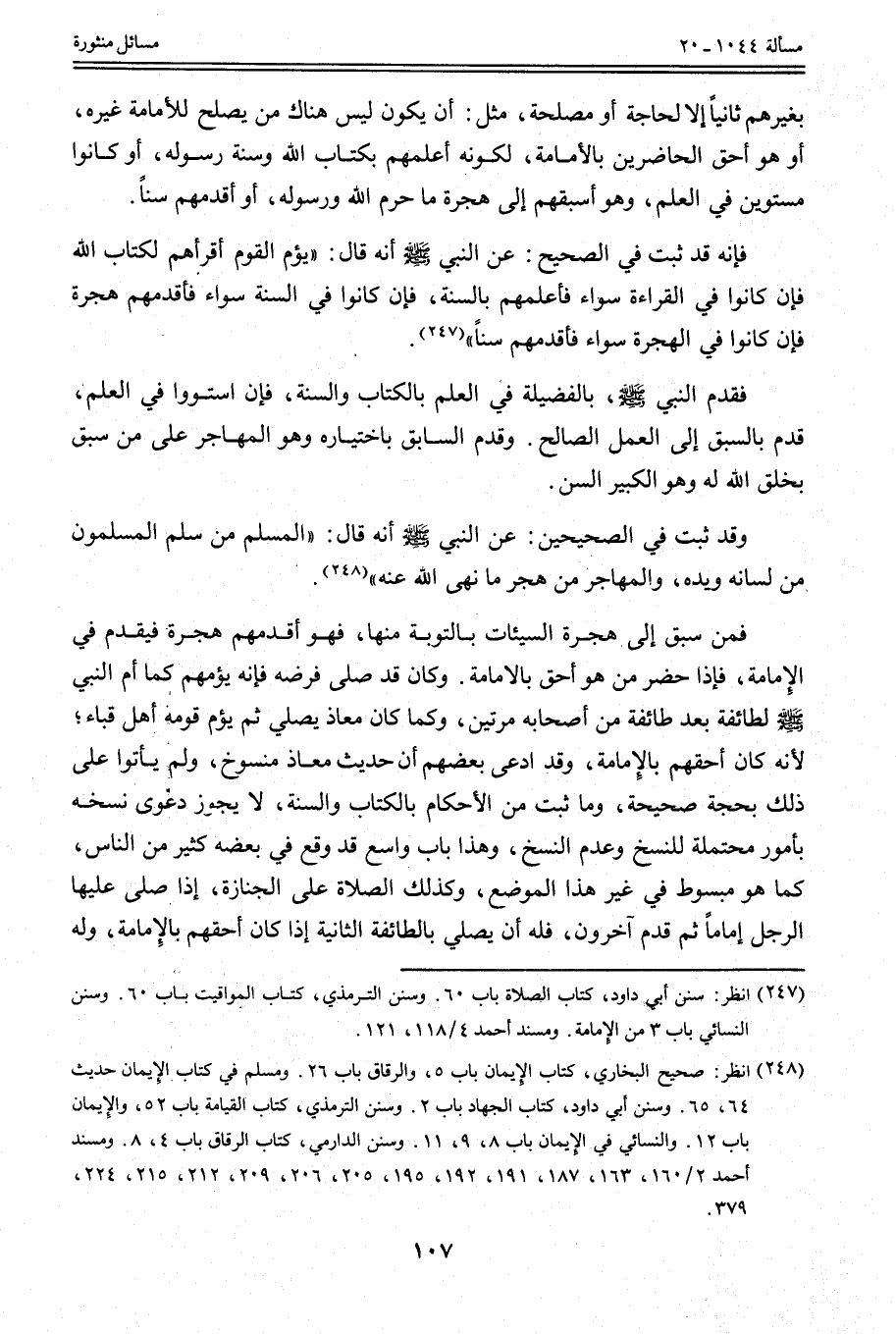 فَإِنَّهُ قَدْ ثَبَتَ فِي الصَّحِيحِ: عَنْ النَّبِيِّ «أَنَّهُ قَالَ: يَؤُمُّ الْقَوْمَ أَقْرَؤُهُمْ لِكِتَابِ اللَّهِ فَإِنْ كَانُوا فِي الْقِرَاءَةِ سَوَاءً فَأَعْلَمُهُمْ بِالسُّنَّةِ، فَإِنْ كَانُوا فِي السُّنَّةِ سَوَاءً فَأَقْدَمُهُمْ هِجْرَةً فَإِنْ كَانُوا فِي الْهِجْرَةِ سَوَاءً فَأَقْدَمُهُمْ سِنًّا» .