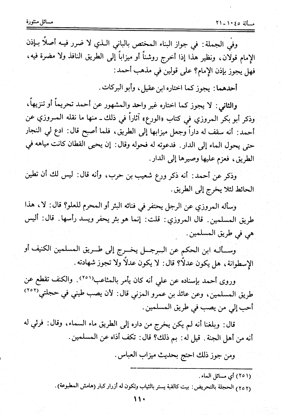 وَفِي الْجُمْلَةِ: فِي جَوَازِ الْبِنَاءِ الْمُخْتَصِّ بِالْبَانِي الَّذِي لَا ضَرَرَ فِيهِ أَصْلًا بِإِذْنِ الْإِمَامِ قَوْلَانِ، وَنَظِيرُ هَذَا إذَا أَخْرَجَ رَوْشَنًا أَوْ مِيزَابًا إلَى الطَّرِيقِ النَّافِذِ وَلَا مَضَرَّةَ فِيهِ، فَهَلْ يَجُوزُ بِإِذْنِ الْإِمَامِ؟ عَلَى قَوْلَيْنِ فِي مَذْهَبِ أَحْمَدَ: أَحَدُهُمَا: يَجُوزُ كَمَا اخْتَارَهُ ابْنُ عَقِيلٍ، وَأَبُو الْبَرَكَاتِ.