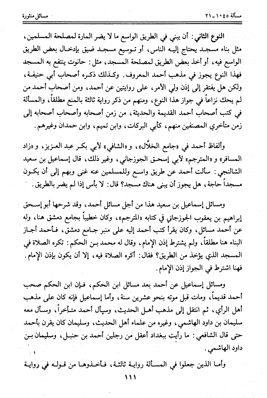 وَمَسَائِلُ إسْمَاعِيلَ بْنِ سَعِيدٍ هَذَا مِنْ أَجَلِّ مَسَائِلِ أَحْمَدَ، وَقَدْ شَرَحَهَا أَبُو إِسْحَاقَ إبْرَاهِيمُ بْنُ يَعْقُوبَ الْجُوزَجَانِيُّ فِي كِتَابِهِ " الْمُتَرْجَمِ "، وَكَانَ خَطِيبًا بِجَامِعِ دِمَشْقَ هُنَا، وَلَهُ عَنْ أَحْمَدَ مَسَائِلُ، وَكَانَ يُقْرَأُ كُتُبُ أَحْمَدَ إلَيْهِ عَلَى مِنْبَرِ جَامِعِ دِمَشْقَ، فَأَحْمَدُ أَجَازَ الْبِنَاءَ هُنَا مُطْلَقًا، وَلَمْ يَشْتَرِطْ إذْنَ الْإِمَامِ، وَقَالَ لَهُ مُحَمَّدُ بْنُ الْحَكَمِ: تُكْرَهُ الصَّلَاةُ فِي الْمَسْجِدِ الَّذِي يُؤْخَذُ مِنْ الطَّرِيقِ؟ فَقَالَ: أَكْرَهُ الصَّلَاةَ فِيهِ، إلَّا أَنْ يَكُونَ بِإِذْنِ الْإِمَامِ.