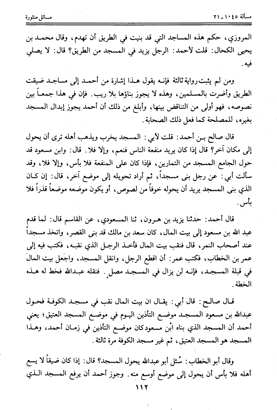 الْمَرُّوذِيُّ، حُكْمُ هَذِهِ الْمَسَاجِدِ الَّتِي قَدْ بُنِيَتْ فِي الطَّرِيقِ أَنْ تُهْدَمَ، وَقَالَ مُحَمَّدُ بْنُ يَحْيَى الْكَحَّالُ: قُلْتُ لِأَحْمَدَ: الرَّجُلُ يَزِيدُ فِي الْمَسْجِدِ مِنْ الطَّرِيقِ؟ قَالَ: لَا يُصَلَّى فِيهِ.