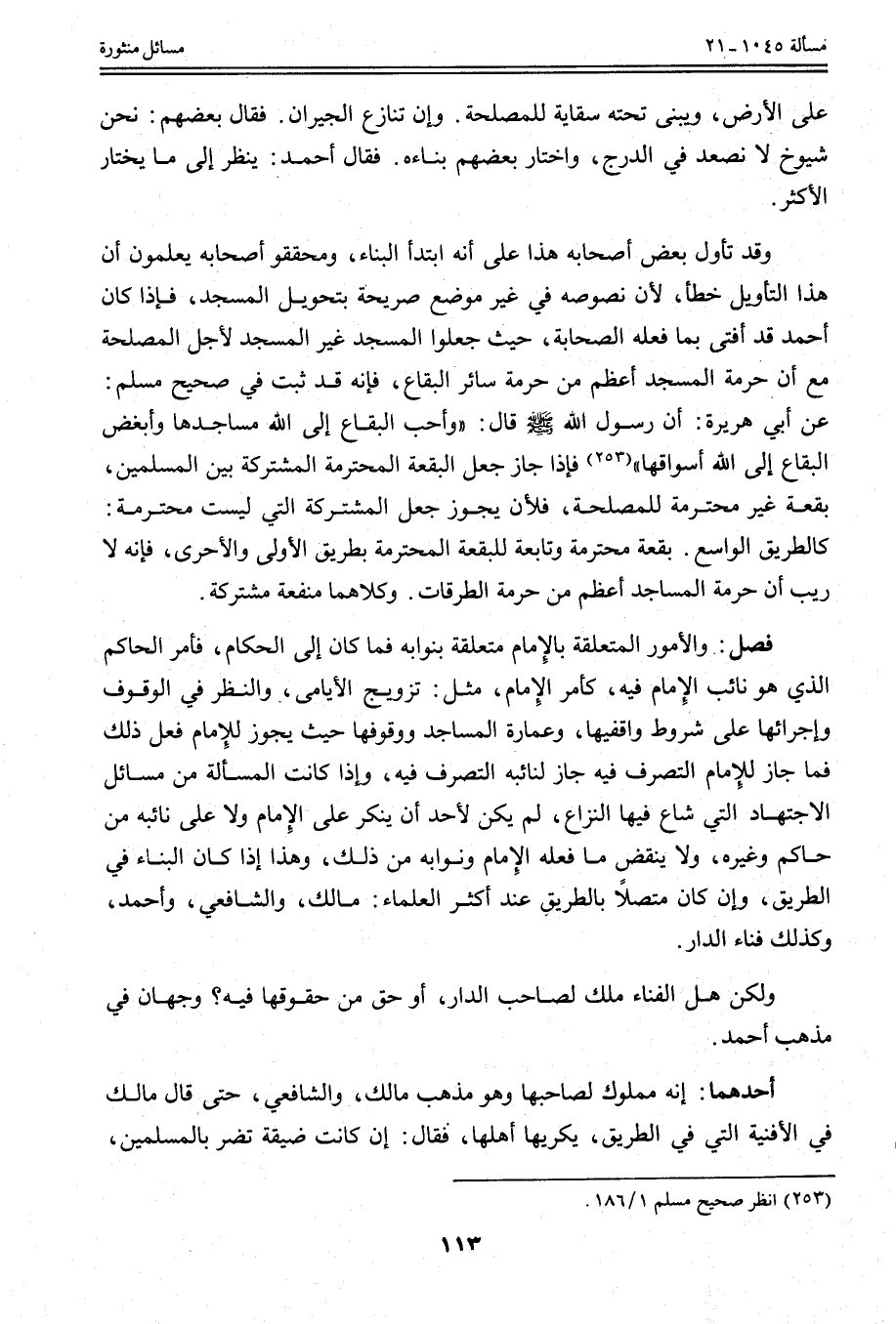 وَقَدْ تَأَوَّلَ بَعْضُ أَصْحَابِهِ هَذَا عَلَى أَنَّهُ ابْتَدَأَ الْبِنَاءَ، وَمُحَقِّقُو أَصْحَابِهِ يَعْلَمُونَ أَنَّ هَذَا التَّأْوِيلَ خَطَأٌ، لِأَنَّ نُصُوصَهُ فِي غَيْرِ مَوْضِعٍ صَرِيحَةٌ بِتَحْوِيلِ الْمَسْجِدِ، فَإِذَا كَانَ أَحْمَدُ قَدْ أَفْتَى بِمَا فَعَلَهُ الصَّحَابَةُ، حَيْثُ جَعَلُوا الْمَسْجِدَ غَيْرَ الْمَسْجِدِ لِأَجْلِ الْمَصْلَحَةِ مَعَ أَنَّ حُرْمَةَ الْمَسْجِدِ أَعْظَمُ مِنْ حُرْمَةِ سَائِرِ الْبِقَاعِ، فَإِنَّهُ قَدْ ثَبَتَ فِي صَحِيحِ مُسْلِمٍ: عَنْ أَبِي هُرَيْرَةَ: «أَنَّ رَسُولَ اللَّهِ قَالَ: وَأَحَبُّ الْبِقَاعِ إلَى اللَّهِ مَسَاجِدُهَا وَأَبْغَضُ الْبِقَاعِ إلَى اللَّهِ أَسْوَاقُهَا»