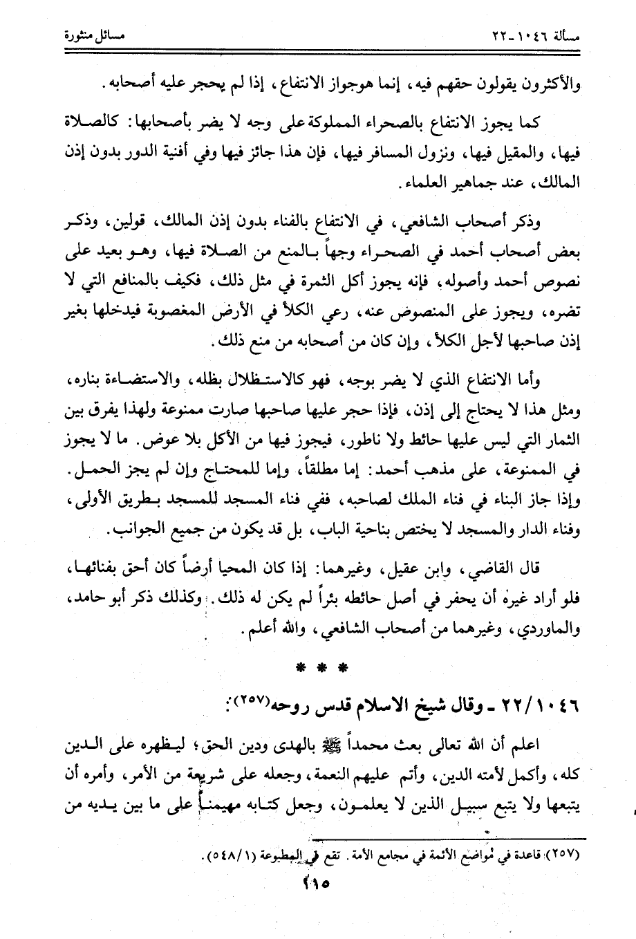 1046 - 22 وَقَالَ شَيْخُ الْإِسْلَامِ قَدَّسَ رُوحَهُ: اعْلَمْ أَنَّ اللَّهَ تَعَالَى بَعَثَ مُحَمَّدًا - صَلَّى اللَّهُ عَلَيْهِ وَسَلَّمَ - بِالْهُدَى وَدِينِ الْحَقِّ لِيُظْهِرَهُ عَلَى الدِّينِ كُلِّهِ، وَأَكْمَلَ لِأُمَّتِهِ الدِّينَ، وَأَتَمَّ عَلَيْهِمْ النِّعْمَةَ، وَجَعَلَهُ عَلَى شَرِيعَةٍ مِنْ الْأَمْرِ، وَأَمَرَهُ أَنْ يَتَّبِعَهَا وَلَا يَتَّبِعَ سَبِيلَ الَّذِينَ لَا يَعْلَمُونَ، وَجَعَلَ كِتَابَهُ مُهَيْمِنًا عَلَى مَا بَيْنَ يَدَيْهِ مِنْ