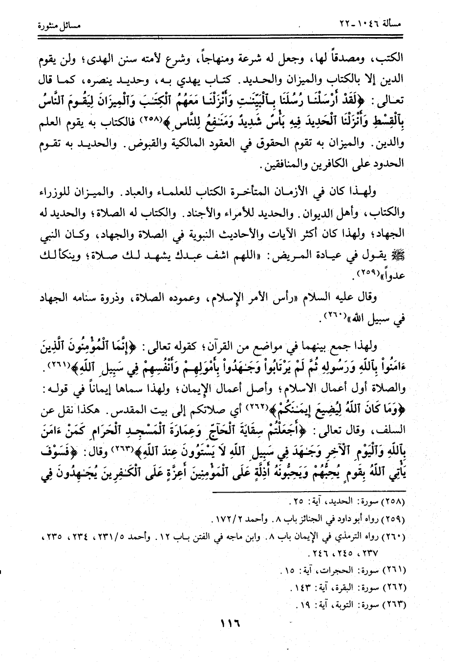 وَالْكِتَابُ لَهُ الصَّلَاةُ؛ وَالْحَدِيدُ لَهُ الْجِهَادُ؛ وَلِهَذَا كَانَ أَكْثَرُ الْآيَاتِ وَالْأَحَادِيثِ النَّبَوِيَّةِ فِي الصَّلَاةِ وَالْجِهَادِ، وَكَانَ النَّبِيُّ - صَلَّى اللَّهُ عَلَيْهِ وَسَلَّمَ - يَقُولُ فِي عِيَادَةِ الْمَرِيضِ: «اللَّهُمَّ اشْفِ عَبْدَك يَشْهَدُ لَك صَلَاةً؛ وَيَنْكَأُ لَك عَدُوًّا» .
