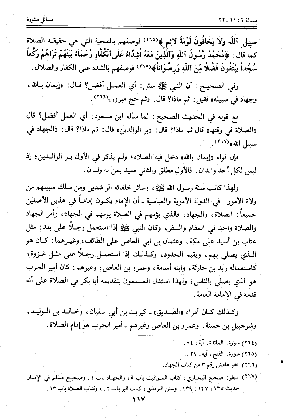 وَلِهَذَا كَانَتْ سُنَّةُ رَسُولِ اللَّهِ - صَلَّى اللَّهُ عَلَيْهِ وَسَلَّمَ - وَسَائِرِ خُلَفَائِهِ الرَّاشِدِينَ وَمَنْ سَلَكَ سَبِيلَهُمْ مِنْ وُلَاةِ الْأُمُورِ - فِي الدَّوْلَةِ الْأُمَوِيَّةِ وَالْعَبَّاسِيَّةِ - أَنَّ الْإِمَامَ يَكُونُ إمَامًا فِي هَذَيْنِ الْأَصْلَيْنِ جَمِيعًا: الصَّلَاةِ، وَالْجِهَادِ.