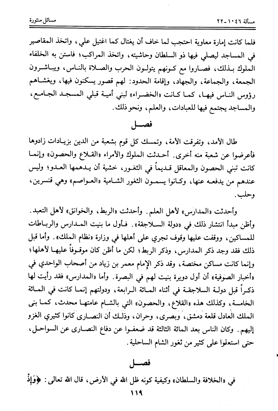 وَأَمَّا " الْمَدَارِسُ " فَقَدْ رَأَيْتُ لَهَا ذِكْرًا قَبْلَ دَوْلَةِ السَّلَاجِقَةِ فِي أَثْنَاءِ الْمِائَةِ الرَّابِعَةِ، وَدَوْلَتُهُمْ إنَّمَا كَانَتْ فِي الْمِائَةِ الْخَامِسَةِ، وَكَذَلِكَ هَذِهِ " الْقِلَاعُ، وَالْحُصُونُ " الَّتِي بِالشَّامِ عَامَّتُهَا مُحْدَثٌ، كَمَا بَنَى الْمَلِكُ الْعَادِلُ قَلْعَةَ دِمَشْقَ، وَبُصَرَى وَحَرَّانَ، وَذَلِكَ أَنَّ النَّصَارَى كَانُوا كَثِيرِي الْغَزْوِ إلَيْهِمْ.