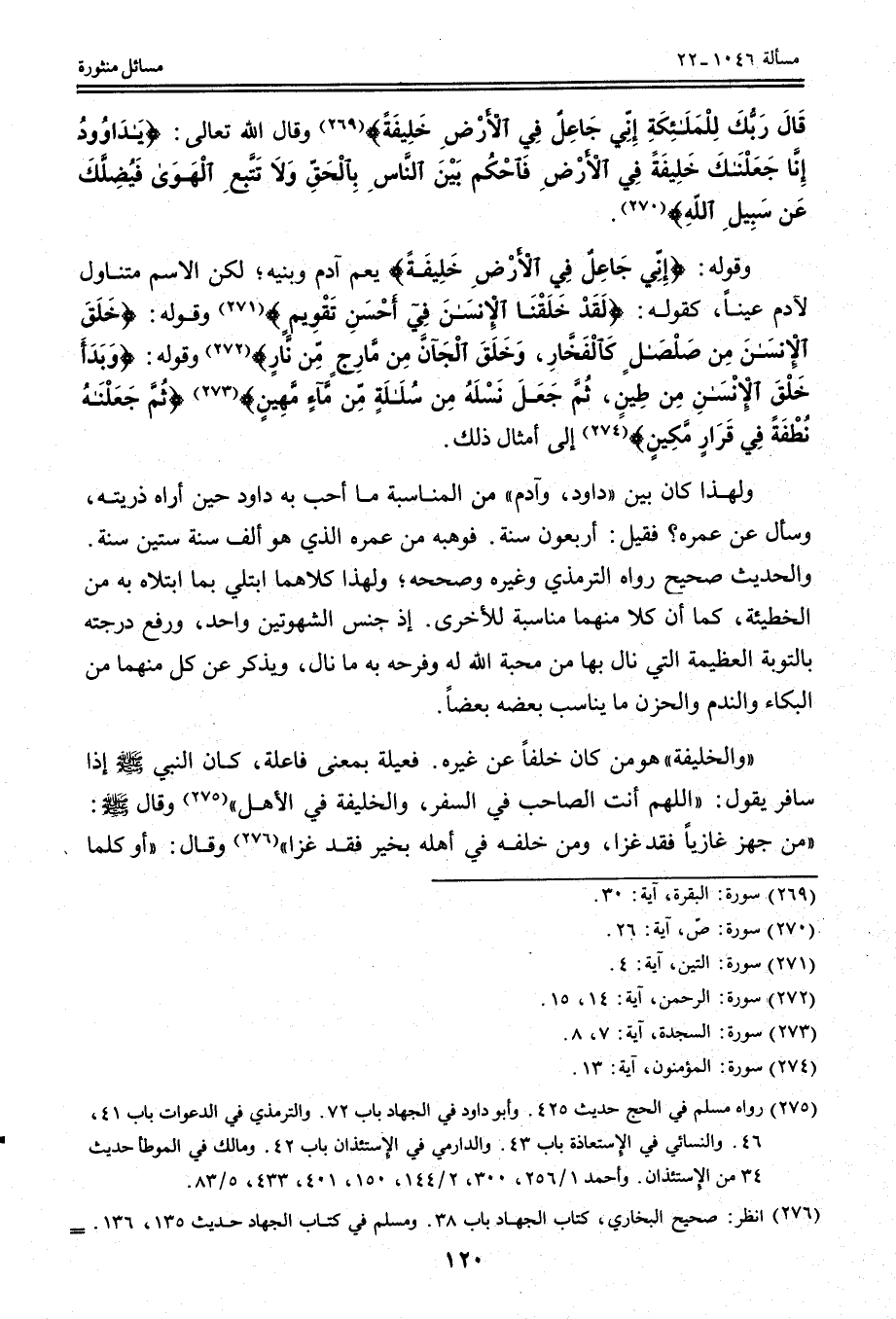 وَقَوْلُهُ: {إِنِّي جَاعِلٌ فِي الأَرْضِ خَلِيفَةً} [البقرة: 30] يَعُمُّ آدَمَ وَبَنِيهِ؛ لَكِنَّ الِاسْمَ مُتَنَاوِلٌ لِآدَمَ عَيْنًا، كَقَوْلِهِ: {لَقَدْ خَلَقْنَا الإِنْسَانَ فِي أَحْسَنِ تَقْوِيمٍ} [التين: 4] وَقَوْلِهِ: {خَلَقَ الإِنْسَانَ مِنْ صَلْصَالٍ كَالْفَخَّارِ} [الرحمن: 14] {وَخَلَقَ الْجَانَّ مِنْ مَارِجٍ مِنْ نَارٍ} [الرحمن: 15] وَقَوْلِهِ: {وَبَدَأَ خَلْقَ الإِنْسَانِ مِنْ طِينٍ} [السجدة: 7] {ثُمَّ جَعَلَ نَسْلَهُ مِنْ سُلالَةٍ مِنْ مَاءٍ مَهِينٍ} [السجدة: 8] {ثُمَّ جَعَلْنَاهُ نُطْفَةً فِي قَرَارٍ مَكِينٍ} [المؤمنون: 13] إلَى أَمْثَالِ ذَلِكَ.