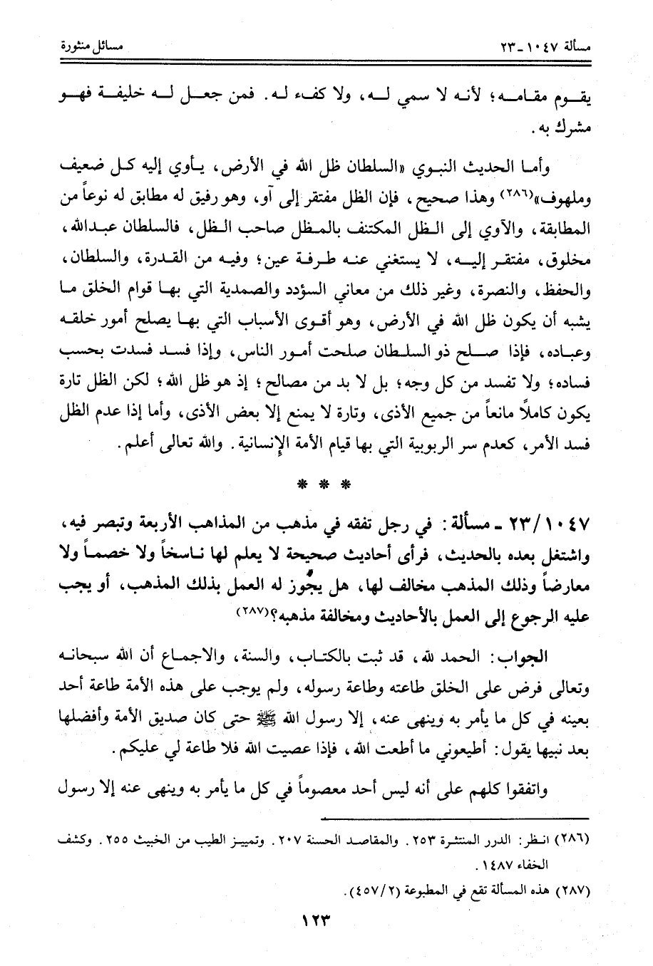 الْجَوَابُ: الْحَمْدُ لِلَّهِ، قَدْ ثَبَتَ بِالْكِتَابِ، وَالسُّنَّةِ، وَالْإِجْمَاعِ أَنَّ اللَّهَ سُبْحَانَهُ وَتَعَالَى فَرَضَ عَلَى الْخَلْقِ طَاعَتَهُ وَطَاعَةَ رَسُولِهِ، وَلَمْ يُوجِبْ عَلَى هَذِهِ الْأُمَّةِ طَاعَةَ أَحَدٍ بِعَيْنِهِ فِي كُلِّ مَا يَأْمُرُ بِهِ وَيَنْهَى عَنْهُ، إلَّا رَسُولَ اللَّهِ - صَلَّى اللَّهُ عَلَيْهِ وَسَلَّمَ - حَتَّى كَانَ صِدِّيقُ الْأُمَّةِ وَأَفْضَلُهَا بَعْدَ نَبِيِّهَا يَقُولُ: أَطِيعُونِي مَا أَطَعْتُ اللَّهَ، فَإِذَا عَصَيْتُ اللَّهَ فَلَا طَاعَةَ لِي عَلَيْكُمْ.