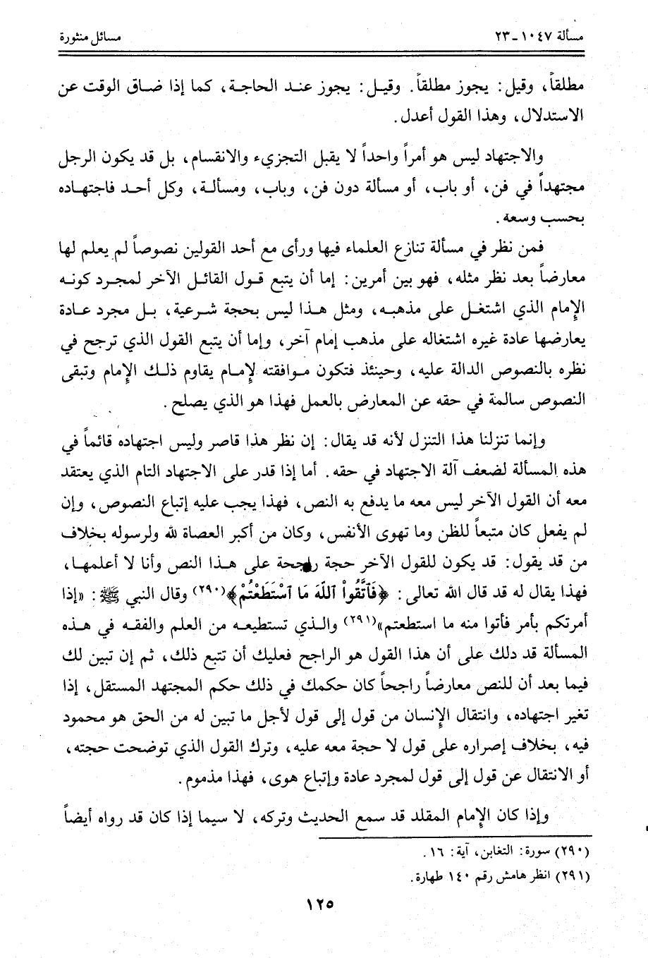 أَمَّا إذَا قَدَرَ عَلَى الِاجْتِهَادِ التَّامِّ الَّذِي يَعْتَقِدُ مَعَهُ أَنَّ الْقَوْلَ الْآخَرَ لَيْسَ مَعَهُ مَا يَدْفَعُ بِهِ النَّصَّ، فَهَذَا يَجِبُ عَلَيْهِ اتِّبَاعُ النُّصُوصِ، وَإِنْ لَمْ يَفْعَلْ كَانَ مُتَّبِعًا لِلظَّنِّ وَمَا تَهْوَى الْأَنْفُسُ، وَكَانَ مِنْ أَكْبَرِ الْعُصَاةِ لِلَّهِ وَلِرَسُولِهِ بِخِلَافِ مَنْ قَدْ يَقُولُ: قَدْ يَكُونُ لِلْقَوْلِ الْآخَرِ حُجَّةٌ رَاجِحَةٌ عَلَى هَذَا النَّصِّ وَأَنَا لَا أَعْلَمُهَا، فَهَذَا يُقَالُ لَهُ قَدْ قَالَ اللَّهُ تَعَالَى: {فَاتَّقُوا اللَّهَ مَا اسْتَطَعْتُمْ} [التغابن: 16] وَقَالَ النَّبِيُّ: «إذَا أَمَرْتُكُمْ بِأَمْرٍ فَأْتُوا مِنْهُ مَا اسْتَطَعْتُمْ» وَاَلَّذِي تَسْتَطِيعُهُ مِنْ الْعِلْمِ وَالْفِقْهِ فِي هَذِهِ الْمَسْأَلَةِ قَدْ دَلَّكَ عَلَى أَنَّ هَذَا الْقَوْلَ هُوَ الرَّاجِحُ فَعَلَيْكَ أَنْ تَتَّبِعَ ذَلِكَ، ثُمَّ إنْ تَبَيَّنَ لَك فِيمَا بَعْدُ أَنَّ لِلنَّصِّ مُعَارِضًا رَاجِحًا كَانَ حُكْمُكَ فِي ذَلِكَ حُكْمَ الْمُجْتَهِدِ الْمُسْتَقِلِّ، إذَا تَغَيَّرَ اجْتِهَادُهُ وَانْتِقَالُ الْإِنْسَانِ مِنْ قَوْلٍ إلَى قَوْلٍ لِأَجْلِ مَا تَبَيَّنَ مِنْ الْحَقِّ هُوَ مَحْمُودٌ فِيهِ، بِخِلَافِ إصْرَارِهِ عَلَى قَوْلٍ لَا حُجَّةَ مَعَهُ عَلَيْهِ، وَتَرْكُ الْقَوْلِ الَّذِي تَوَضَّحَتْ حُجَّتُهُ، أَوْ الِانْتِقَالُ عَنْ قَوْلٍ إلَى قَوْلٍ لِمُجَرَّدِ عَادَةٍ وَاتِّبَاعِ هَوًى، فَهَذَا مَذْمُومٌ.
