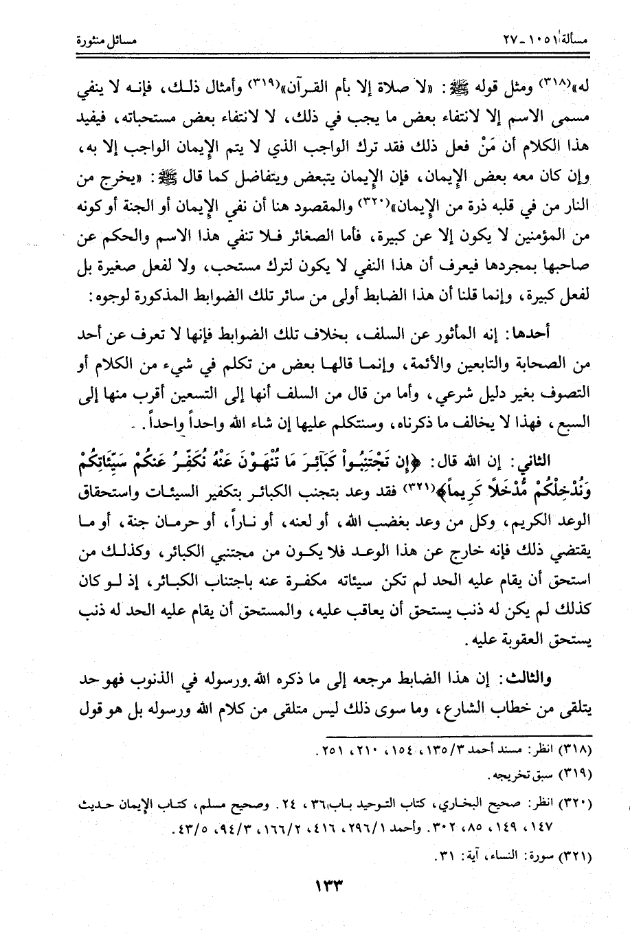 لَهُ» وَمِثْلُ قَوْلِهِ: «لَا صَلَاةَ إلَّا بِأُمِّ الْقُرْآنِ» وَأَمْثَالُ ذَلِكَ، فَإِنَّهُ لَا يَنْفِي مُسَمَّى الِاسْمِ إلَّا لِانْتِفَاءِ بَعْضِ مَا يَجِبُ فِي ذَلِكَ، لَا لِانْتِفَاءِ بَعْضِ مُسْتَحَبَّاتِهِ، فَيُفِيدُ هَذَا الْكَلَامُ أَنَّ مَنْ فَعَلَ ذَلِكَ فَقَدْ تَرَكَ الْوَاجِبَ الَّذِي لَا يَتِمُّ الْإِيمَانُ الْوَاجِبُ إلَّا بِهِ، وَإِنْ كَانَ مَعَهُ بَعْضُ الْإِيمَانِ، فَإِنَّ الْإِيمَانَ يَتَبَعَّضُ وَيَتَفَاضَلُ كَمَا قَالَ: «يَخْرُجُ مِنْ النَّارِ مَنْ فِي قَلْبِهِ ذَرَّةٌ مِنْ الْإِيمَانِ» وَالْمَقْصُودُ هُنَا أَنَّ نَفْيَ الْإِيمَانِ أَوْ الْجَنَّةِ أَوْ كَوْنِهِ مِنْ الْمُؤْمِنِينَ لَا يَكُونُ إلَّا عَنْ كَبِيرَةٍ، فَأَمَّا الصَّغَائِرُ فَلَا تَنْفِي هَذَا الِاسْمَ وَالْحُكْمَ عَنْ صَاحِبِهَا بِمُجَرَّدِهَا فَيُعْرَفُ أَنَّ هَذَا النَّفْيَ لَا يَكُونُ لِتَرْكِ مُسْتَحَبٍّ، وَلَا لِفِعْلِ صَغِيرَةٍ بَلْ لِفِعْلِ كَبِيرَةٍ، وَإِنَّمَا قُلْنَا إنَّ هَذَا الضَّابِطَ أَوْلَى مِنْ سَائِرِ تِلْكَ الضَّوَابِطِ الْمَذْكُورَةِ لِوُجُوهٍ: أَحَدُهَا: أَنَّهُ الْمَأْثُورُ عَنْ السَّلَفِ، بِخِلَافِ تِلْكَ الضَّوَابِطِ فَإِنَّهَا لَا تُعْرَفُ عَنْ أَحَدٍ مِنْ الصَّحَابَةِ وَالتَّابِعِينَ وَالْأَئِمَّةِ، وَإِنَّمَا قَالَهَا بَعْضُ مَنْ تَكَلَّمَ فِي شَيْءٍ مِنْ الْكَلَامِ أَوْ التَّصَوُّفِ بِغَيْرِ دَلِيلٍ شَرْعِيٍّ، وَأَمَّا مَنْ قَالَ مِنْ السَّلَفِ إنَّهَا إلَى التِّسْعِينَ أَقْرَبُ مِنْهَا إلَى السَّبْعِ، فَهَذَا لَا يُخَالِفُ مَا ذَكَرْنَاهُ، وَسَنَتَكَلَّمُ عَلَيْهَا إنْ شَاءَ اللَّهُ وَاحِدًا وَاحِدًا.