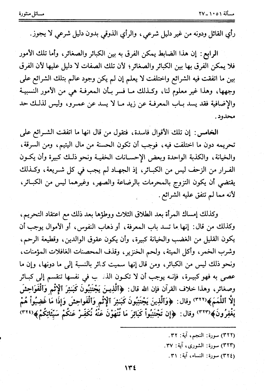 وَكَذَلِكَ إمْسَاكُ الْمَرْأَةِ بَعْدَ الطَّلَاقِ الثَّلَاثِ وَوَطْؤُهَا بَعْدَ ذَلِكَ مَعَ اعْتِقَادِ التَّحْرِيمِ، وَكَذَلِكَ مَنْ قَالَ: إنَّهَا مَا تَسُدُّ بَابَ الْمَعْرِفَةِ، أَوْ ذَهَابُ النُّفُوسِ، أَوْ الْأَمْوَالِ يُوجِبُ أَنْ يَكُونَ الْقَلِيلُ مِنْ الْغَضَبِ وَالْخِيَانَةِ كَبِيرَةً، وَأَنْ يَكُونَ عُقُوقُ الْوَالِدَيْنِ، وَقَطِيعَةُ الرَّحِمِ، وَشُرْبُ الْخَمْرِ، وَأَكْلُ الْمَيْتَةِ، وَلَحْمُ الْخِنْزِيرِ، وَقَذْفُ الْمُحْصَنَاتِ الْغَافِلَاتِ الْمُؤْمِنَاتِ، وَنَحْوُ ذَلِكَ لَيْسَ مِنْ الْكَبَائِرِ، وَمَنْ قَالَ إنَّهَا سُمِّيَتْ كَبَائِرَ بِالنِّسْبَةِ إلَى مَا دُونَهَا، وَإِنَّ مَا عَصَى بِهِ فَهُوَ كَبِيرَةٌ، فَإِنَّهُ يُوجِبُ أَنْ لَا تَكُونَ الذُّنُوبُ فِي نَفْسِهَا تَنْقَسِمُ إلَى كَبَائِرَ وَصَغَائِرَ، وَهَذَا خِلَافُ الْقُرْآنِ فَإِنَّ اللَّهَ قَالَ: {الَّذِينَ يَجْتَنِبُونَ كَبَائِرَ الإِثْمِ وَالْفَوَاحِشَ إِلا اللَّمَمَ} [النجم: 32] وَقَالَ: {وَالَّذِينَ يَجْتَنِبُونَ كَبَائِرَ الإِثْمِ وَالْفَوَاحِشَ وَإِذَا مَا غَضِبُوا هُمْ يَغْفِرُونَ} [الشورى: 37] وَقَالَ: {إِنْ تَجْتَنِبُوا كَبَائِرَ مَا تُنْهَوْنَ عَنْهُ نُكَفِّرْ عَنْكُمْ سَيِّئَاتِكُمْ} [النساء: 31]