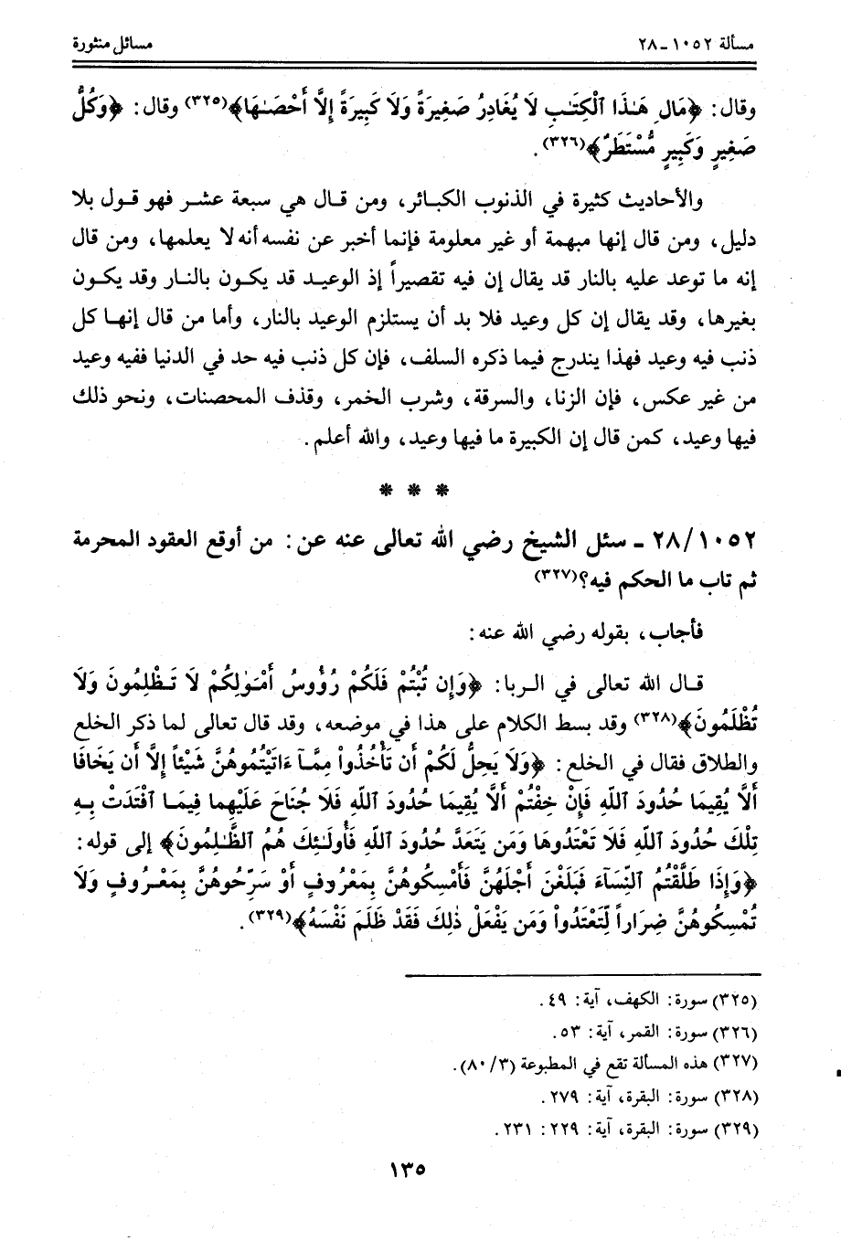 1052 - 28 سُئِلَ الشَّيْخُ - رَضِيَ اللَّهُ تَعَالَى عَنْهُ - عَنْ: مَنْ أَوْقَعَ الْعُقُودَ الْمُحَرَّمَةَ ثُمَّ تَابَ مَا الْحُكْمُ فِيهِ؟ فَأَجَابَ، بِقَوْلِهِ - رَضِيَ اللَّهُ عَنْهُ -: قَالَ اللَّهُ تَعَالَى فِي الرِّبَا: {وَإِنْ تُبْتُمْ فَلَكُمْ رُءُوسُ أَمْوَالِكُمْ لا تَظْلِمُونَ وَلا تُظْلَمُونَ} [البقرة: 279] وَقَدْ بُسِطَ الْكَلَامُ عَلَى هَذَا فِي مَوْضِعِهِ، وَقَدْ قَالَ تَعَالَى لَمَّا ذَكَرَ الْخُلْعَ وَالطَّلَاقَ فَقَالَ فِي الْخُلْعِ: {وَلا يَحِلُّ لَكُمْ أَنْ تَأْخُذُوا مِمَّا آتَيْتُمُوهُنَّ شَيْئًا إِلا أَنْ يَخَافَا أَلا يُقِيمَا حُدُودَ اللَّهِ فَإِنْ خِفْتُمْ أَلا يُقِيمَا حُدُودَ اللَّهِ فَلا جُنَاحَ عَلَيْهِمَا فِيمَا افْتَدَتْ بِهِ تِلْكَ حُدُودُ اللَّهِ فَلا تَعْتَدُوهَا وَمَنْ يَتَعَدَّ حُدُودَ اللَّهِ فَأُولَئِكَ هُمُ الظَّالِمُونَ} [البقرة: 229] إلَى قَوْلِهِ: {وَإِذَا طَلَّقْتُمُ النِّسَاءَ فَبَلَغْنَ أَجَلَهُنَّ فَأَمْسِكُوهُنَّ بِمَعْرُوفٍ أَوْ سَرِّحُوهُنَّ بِمَعْرُوفٍ وَلا تُمْسِكُوهُنَّ ضِرَارًا لِتَعْتَدُوا وَمَنْ يَفْعَلْ ذَلِكَ فَقَدْ ظَلَمَ نَفْسَهُ} [البقرة: 231] .