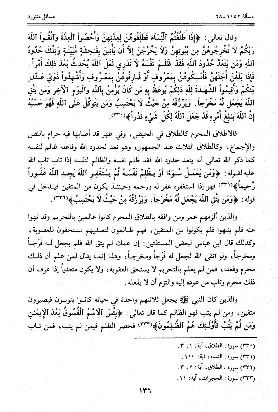 فَالطَّلَاقُ الْمُحَرَّمُ كَالطَّلَاقِ فِي الْحَيْضِ، وَفِي طُهْرٍ قَدْ أَصَابَهَا فِيهِ حَرَامٌ بِالنَّصِّ وَالْإِجْمَاعِ، وَكَالطَّلَاقِ الثَّلَاثِ عِنْدَ الْجُمْهُورِ، وَهُوَ تَعَدٍّ لِحُدُودِ اللَّهِ وَفَاعِلُهُ ظَالِمٌ لِنَفْسِهِ كَمَا ذَكَرَ اللَّهُ تَعَالَى أَنَّهُ مَنْ يَتَعَدَّ حُدُودَ اللَّهِ فَقَدْ ظَلَمَ نَفْسَهُ وَالظَّالِمُ لِنَفْسِهِ إذَا تَابَ تَابَ اللَّهُ عَلَيْهِ لِقَوْلِهِ: {وَمَنْ يَعْمَلْ سُوءًا أَوْ يَظْلِمْ نَفْسَهُ ثُمَّ يَسْتَغْفِرِ اللَّهَ يَجِدِ اللَّهَ غَفُورًا رَحِيمًا} [النساء: 110] فَهُوَ إذَا اسْتَغْفَرَهُ غَفَرَ لَهُ وَرَحِمَهُ وَحِينَئِذٍ يَكُونُ مِنْ الْمُتَّقِينَ فَيَدْخُلُ فِي قَوْلِهِ: {وَمَنْ يَتَّقِ اللَّهَ يَجْعَلْ لَهُ مَخْرَجًا} [الطلاق: 2] {وَيَرْزُقْهُ مِنْ حَيْثُ لا يَحْتَسِبُ} [الطلاق: 3] .
