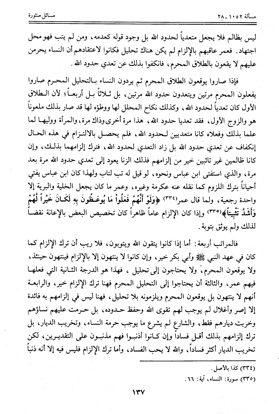 فَإِذَا صَارُوا يُوقِعُونَ الطَّلَاقَ الْمُحَرَّمَ ثُمَّ يَرُدُّونَ النِّسَاءَ بِالتَّحْلِيلِ الْمُحَرَّمِ صَارُوا يَفْعَلُونَ الْمُحَرَّمَ مَرَّتَيْنِ وَيَتَعَدَّوْنَ حُدُودَ اللَّهِ مَرَّتَيْنِ، بَلْ ثَلَاثًا بَلْ أَرْبَعًا؛ لِأَنَّ الطَّلَاقَ الْأَوَّلَ كَانَ تَعَدِّيًا لِحُدُودِ اللَّهِ، وَكَذَلِكَ نِكَاحُ الْمُحَلِّلِ لَهَا وَوَطْؤُهُ لَهَا قَدْ صَارَ بِذَلِكَ مَلْعُونًا هُوَ وَالزَّوْجُ الْأَوَّلُ، فَقَدْ تَعَدَّيَا لِحُدُودِ اللَّهِ، هَذَا مَرَّةً أُخْرَى وَذَاكَ مَرَّةً، وَالْمَرْأَةُ وَوَلِيُّهَا لَمَّا عَلِمَا بِذَلِكَ وَفَعَلَاهُ كَانَا مُتَعَدِّيَيْنِ لِحُدُودِ اللَّهِ، فَلَمْ يَحْصُلْ بِالِالْتِزَامِ فِي هَذِهِ الْحَالِ انْكِفَافٌ عَنْ تَعَدِّي حُدُودِ اللَّهِ بَلْ زَادَ التَّعَدِّي لِحُدُودِ اللَّهِ، فَتَرْكُ إلْزَامِهِمَا بِذَلِكَ، وَإِنْ كَانَا ظَالِمَيْنِ غَيْرَ تَائِبَيْنِ خَيْرٌ مِنْ إلْزَامِهِمْ فَذَلِكَ الزِّنَا يَعُودُ إلَى تَعَدِّي حُدُودِ اللَّهِ مَرَّةً بَعْدَ مَرَّةٍ، وَاَلَّذِي اسْتَفْتَى ابْنَ عَبَّاسٍ وَنَحْوَهُ، لَوْ قِيلَ لَهُ تُبْ لَتَابَ وَلِذَا كَانَ ابْنُ عَبَّاسٍ يُفْتِي أَحْيَانَا بِتَرْكِ اللُّزُومِ كَمَا نَقَلَهُ عَنْهُ عِكْرِمَةَ وَغَيْرُهُ، وَعُمَرُ مَا كَانَ يَجْعَلُ الْخَلِيَّةَ وَالْبَرِيَّةَ إلَّا وَاحِدَةً رَجْعِيَّةً، وَلَمَّا قَالَ عُمَرُ {وَلَوْ أَنَّهُمْ فَعَلُوا مَا يُوعَظُونَ بِهِ لَكَانَ خَيْرًا لَهُمْ وَأَشَدَّ تَثْبِيتًا} [النساء: 66] وَإِذَا كَانَ الْإِلْزَامُ عَامًّا ظَاهِرًا كَانَ تَخْصِيصُ الْبَعْضِ بِالْإِعَانَةِ نَقْضًا لِذَلِكَ وَلَمْ يَوْثُقْ بِتَوْبَةٍ.
