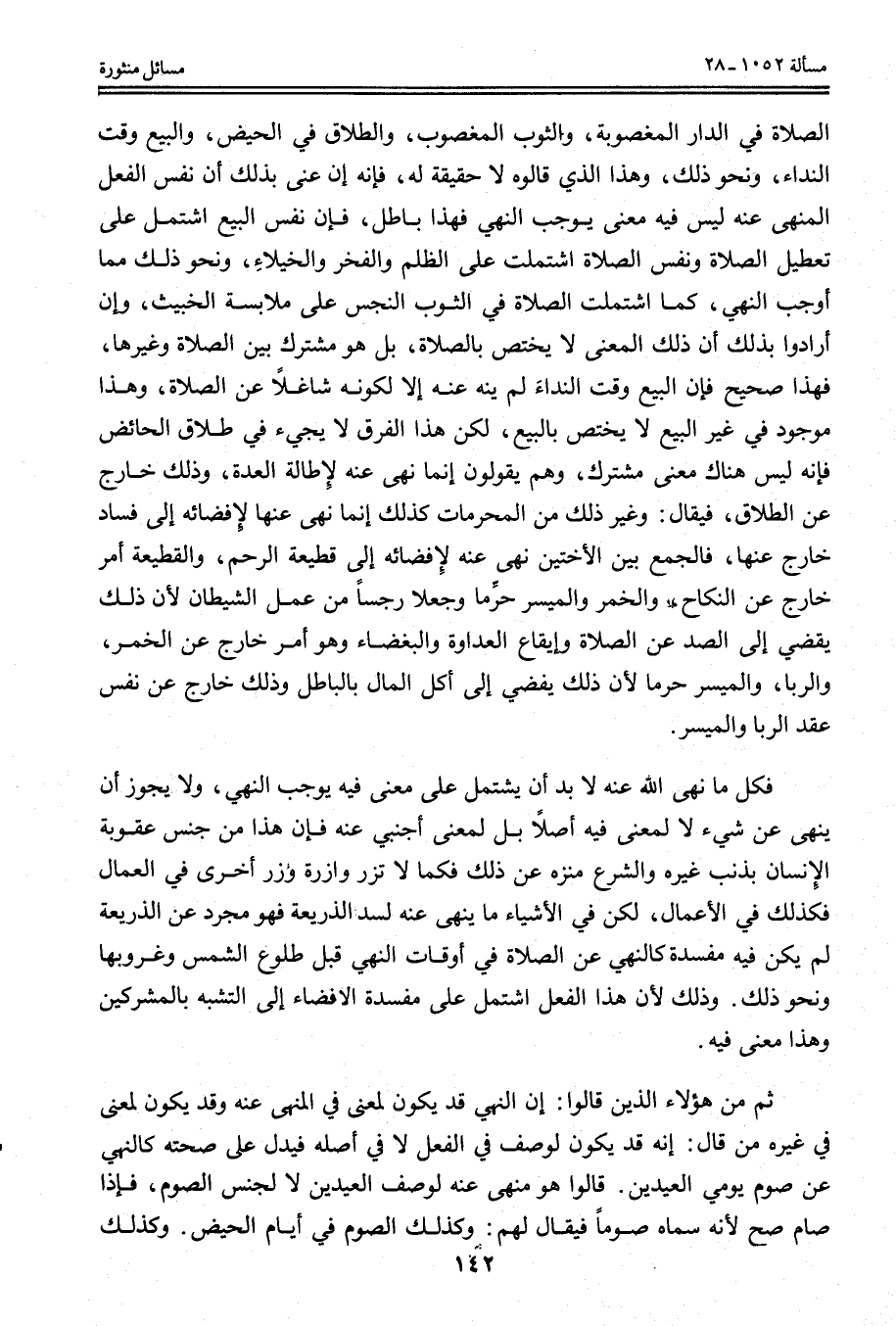 ثُمَّ مِنْ هَؤُلَاءِ الَّذِينَ قَالُوا: إنَّ النَّهْيَ قَدْ يَكُونُ لِمَعْنًى فِي الْمَنْهِيِّ عَنْهُ وَقَدْ يَكُونُ لِمَعْنًى فِي غَيْرِهِ مَنْ قَالَ: إنَّهُ قَدْ يَكُونُ لِوَصْفٍ فِي الْفِعْلِ لَا فِي أَصْلِهِ فَيَدُلُّ عَلَى صِحَّتِهِ كَالنَّهْيِ عَنْ صَوْمِ يَوْمَيْ الْعِيدَيْنِ.
