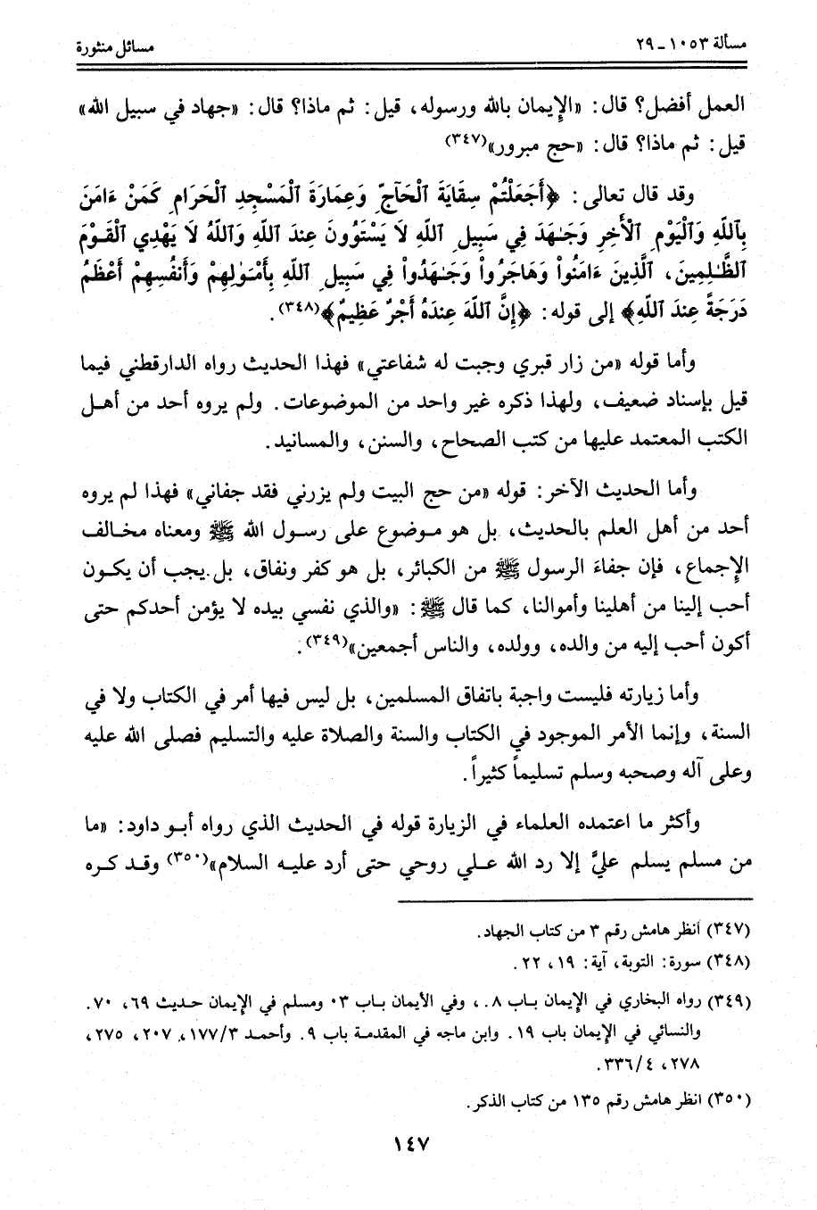 الْعَمَلِ أَفْضَلُ؟ قَالَ: الْإِيمَانُ بِاَللَّهِ وَرَسُولِهِ، قِيلَ: ثُمَّ مَاذَا؟ قَالَ: جِهَادٌ فِي سَبِيلِ اللَّهِ قِيلَ: ثُمَّ مَاذَا؟ قَالَ: حَجٌّ مَبْرُورٌ» وَقَدْ قَالَ تَعَالَى: {أَجَعَلْتُمْ سِقَايَةَ الْحَاجِّ وَعِمَارَةَ الْمَسْجِدِ الْحَرَامِ كَمَنْ آمَنَ بِاللَّهِ وَالْيَوْمِ الآخِرِ وَجَاهَدَ فِي سَبِيلِ اللَّهِ لا يَسْتَوُونَ عِنْدَ اللَّهِ وَاللَّهُ لا يَهْدِي الْقَوْمَ الظَّالِمِينَ - الَّذِينَ آمَنُوا وَهَاجَرُوا وَجَاهَدُوا فِي سَبِيلِ اللَّهِ بِأَمْوَالِهِمْ وَأَنْفُسِهِمْ أَعْظَمُ دَرَجَةً عِنْدَ اللَّهِ} [التوبة: 19 - 20] إلَى قَوْلِهِ: {إِنَّ اللَّهَ عِنْدَهُ أَجْرٌ عَظِيمٌ} [التوبة: 22] .