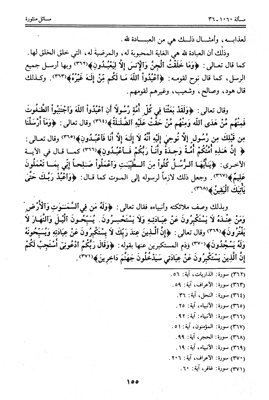 وَذَلِكَ أَنَّ الْعِبَادَةَ لِلَّهِ هِيَ الْغَايَةُ الْمَحْبُوبَةُ لَهُ، وَالْمَرَضِيَّةُ لَهُ، الَّتِي خَلَقَ الْخَلْقَ لَهَا.