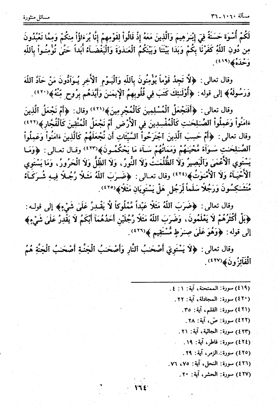 وَقَالَ تَعَالَى: {أَفَنَجْعَلُ الْمُسْلِمِينَ كَالْمُجْرِمِينَ} [القلم: 35] وَقَالَ: {أَمْ نَجْعَلُ الَّذِينَ آمَنُوا وَعَمِلُوا الصَّالِحَاتِ كَالْمُفْسِدِينَ فِي الأَرْضِ أَمْ نَجْعَلُ الْمُتَّقِينَ كَالْفُجَّارِ} [ص: 28] وَقَالَ تَعَالَى: {أَمْ حَسِبَ الَّذِينَ اجْتَرَحُوا السَّيِّئَاتِ أَنْ نَجْعَلَهُمْ كَالَّذِينَ آمَنُوا وَعَمِلُوا الصَّالِحَاتِ سَوَاءً مَحْيَاهُمْ وَمَمَاتُهُمْ سَاءَ مَا يَحْكُمُونَ} [الجاثية: 21] وَقَالَ تَعَالَى: {وَمَا يَسْتَوِي الأَعْمَى وَالْبَصِيرُ - وَلا الظُّلُمَاتُ وَلا النُّورُ - وَلا الظِّلُّ وَلا الْحَرُورُ} [فاطر: 19 - 21] {وَمَا يَسْتَوِي الأَحْيَاءُ وَلا الأَمْوَاتُ} [فاطر: 22] وَقَالَ تَعَالَى: {ضَرَبَ اللَّهُ مَثَلا رَجُلا فِيهِ شُرَكَاءُ مُتَشَاكِسُونَ وَرَجُلا سَلَمًا لِرَجُلٍ هَلْ يَسْتَوِيَانِ مَثَلا} [الزمر: 29] .