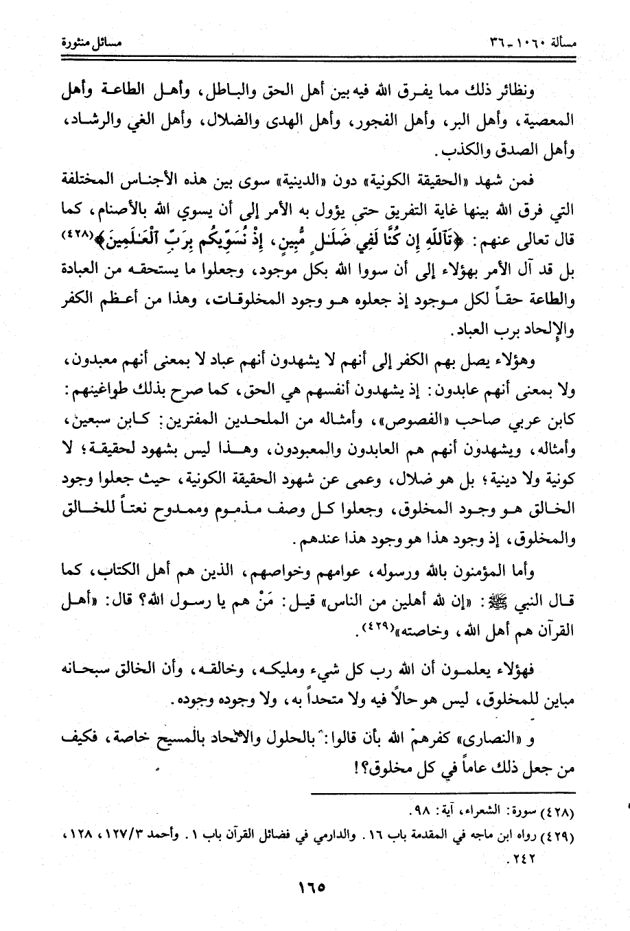 فَمَنْ شَهِدَ " الْحَقِيقَةَ الْكَوْنِيَّةَ " دُونَ " الدِّينِيَّةِ " سَوَّى بَيْنَ هَذِهِ الْأَجْنَاسِ الْمُخْتَلِفَةِ الَّتِي فَرَّقَ اللَّهُ بَيْنَهَا غَايَةَ التَّفْرِيقِ حَتَّى يَئُولَ بِهِ الْأَمْرُ إلَى أَنْ يُسَوِّيَ اللَّهَ بِالْأَصْنَامِ، كَمَا قَالَ تَعَالَى عَنْهُمْ: {تَاللَّهِ إِنْ كُنَّا لَفِي ضَلالٍ مُبِينٍ} [الشعراء: 97] {إِذْ نُسَوِّيكُمْ بِرَبِّ الْعَالَمِينَ} [الشعراء: 98] بَلْ قَدْ آلَ الْأَمْرُ بِهَؤُلَاءِ إلَى أَنْ سَوَّوْا اللَّهَ بِكُلِّ مَوْجُودٍ، وَجَعَلُوا مَا يَسْتَحِقُّهُ مِنْ الْعِبَادَةِ وَالطَّاعَةِ حَقًّا لِكُلِّ مَوْجُودٍ إذْ جَعَلُوهُ هُوَ وُجُودُ الْمَخْلُوقَاتِ، وَهَذَا مِنْ أَعْظَمِ الْكُفْرِ وَالْإِلْحَادِ بِرَبِّ الْعِبَادِ.