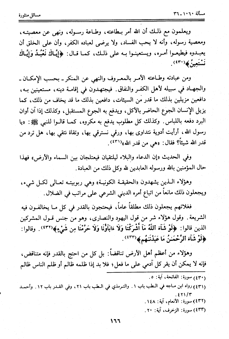 وَيَعْلَمُونَ مَعَ ذَلِكَ أَنَّ اللَّهَ أَمَرَ بِطَاعَتِهِ، وَطَاعَةِ رَسُولِهِ، وَنَهَى عَنْ مَعْصِيَتِهِ، وَمَعْصِيَةِ رَسُولِهِ، وَأَنَّهُ لَا يُحِبُّ الْفَسَادَ، وَلَا يَرْضَى لِعِبَادِهِ الْكُفْرَ، وَأَنَّ عَلَى الْخَلْقِ أَنْ يَعْبُدُوهُ فَيُطِيعُوا أَمْرَهُ، وَيَسْتَعِينُوا بِهِ عَلَى ذَلِكَ، كَمَا قَالَ: {إِيَّاكَ نَعْبُدُ وَإِيَّاكَ نَسْتَعِينُ} [الفاتحة: 5] .