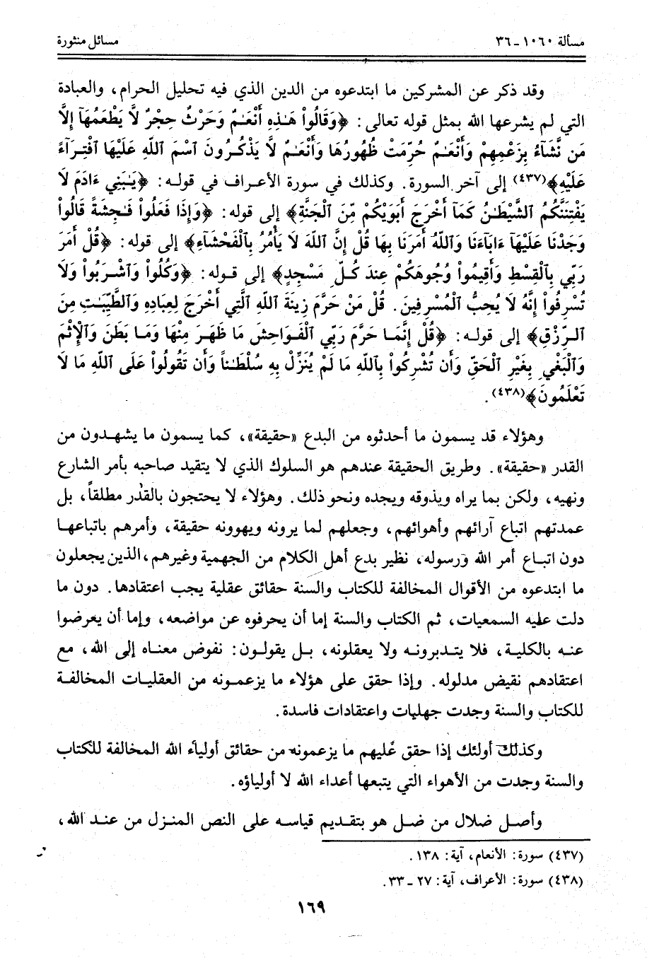 وَقَدْ ذَكَرَ عَنْ الْمُشْرِكِينَ مَا ابْتَدَعُوهُ مِنْ الدِّينِ الَّذِي فِيهِ تَحْلِيلُ الْحَرَامِ، وَالْعِبَادَةُ الَّتِي لَمْ يُشَرِّعْهَا اللَّهُ بِمِثْلٍ قَوْله تَعَالَى: {وَقَالُوا هَذِهِ أَنْعَامٌ وَحَرْثٌ حِجْرٌ لا يَطْعَمُهَا إِلا مَنْ نَشَاءُ بِزَعْمِهِمْ وَأَنْعَامٌ حُرِّمَتْ ظُهُورُهَا وَأَنْعَامٌ لا يَذْكُرُونَ اسْمَ اللَّهِ عَلَيْهَا افْتِرَاءً عَلَيْهِ} [الأنعام: 138] إلَى آخِرِ السُّورَةِ.