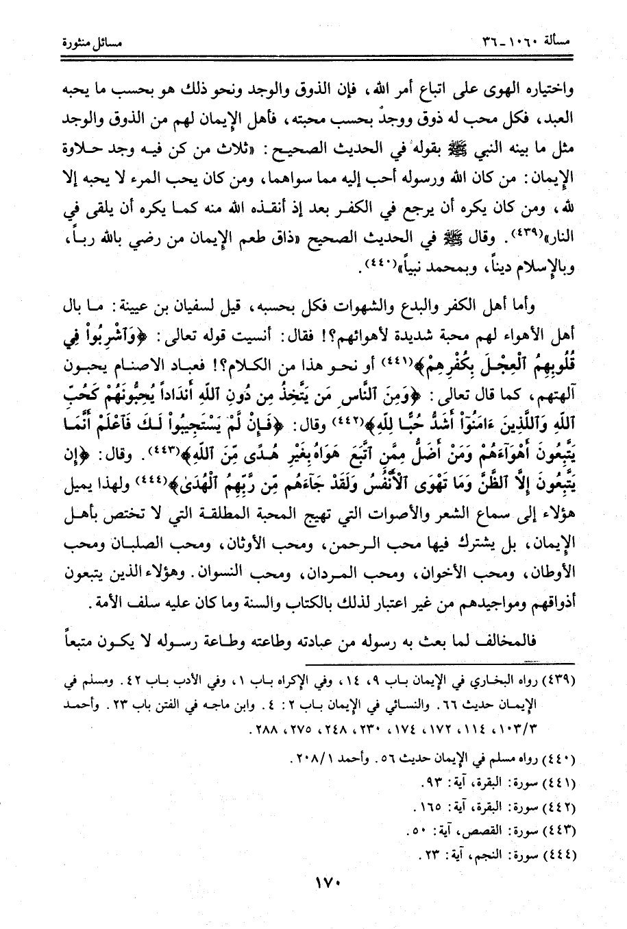 وَاخْتِيَارِهِ الْهَوَى عَلَى اتِّبَاعِ أَمْرِ اللَّهِ، فَإِنَّ الذَّوْقَ وَالْوَجْدَ وَنَحْوَ ذَلِكَ هُوَ بِحَسَبِ مَا يُحِبُّهُ الْعَبْدُ، فَكُلُّ مُحِبٍّ لَهُ ذَوْقٌ وَوَجْدٌ بِحَسَبِ مَحَبَّتِهِ، فَأَهْلُ الْإِيمَانِ لَهُمْ مِنْ الذَّوْقِ وَالْوَجْدِ مِثْلُ مَا بَيَّنَهُ النَّبِيُّ - صَلَّى اللَّهُ عَلَيْهِ وَسَلَّمَ - بِقَوْلِهِ فِي الْحَدِيثِ الصَّحِيحِ: «ثَلَاثٌ مَنْ كُنَّ فِيهِ وَجَدَ حَلَاوَةَ الْإِيمَانِ: مَنْ كَانَ اللَّهُ وَرَسُولُهُ أَحَبَّ إلَيْهِ مِمَّا سِوَاهُمَا، وَمَنْ كَانَ يُحِبُّ الْمَرْءَ لَا يُحِبُّهُ إلَّا لِلَّهِ، وَمَنْ كَانَ يَكْرَهُ أَنْ يَرْجِعَ فِي الْكُفْرِ بَعْدَ إذْ أَنْقَذَهُ اللَّهُ مِنْهُ كَمَا يَكْرَهُ أَنْ يُلْقَى فِي النَّارِ» .