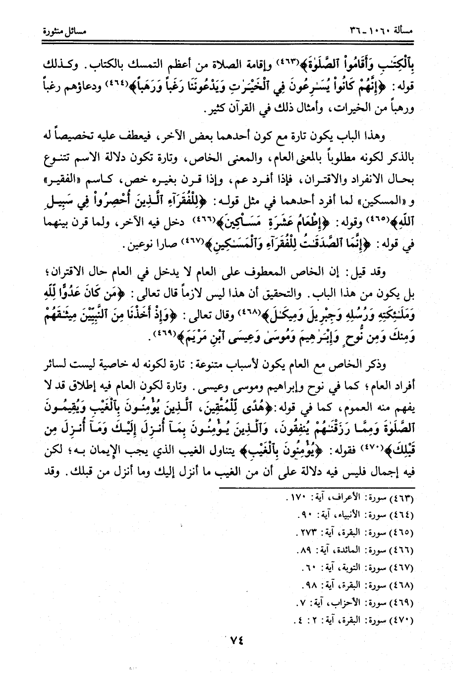 وَذِكْرُ الْخَاصِّ مَعَ الْعَامِّ يَكُونُ لِأَسْبَابٍ مُتَنَوِّعَةٍ: تَارَةً لِكَوْنِهِ لَهُ خَاصِّيَّةٌ لَيْسَتْ لِسَائِرِ أَفْرَادِ الْعَامِّ؛ كَمَا فِي نُوحٍ وَإِبْرَاهِيمَ وَمُوسَى وَعِيسَى.