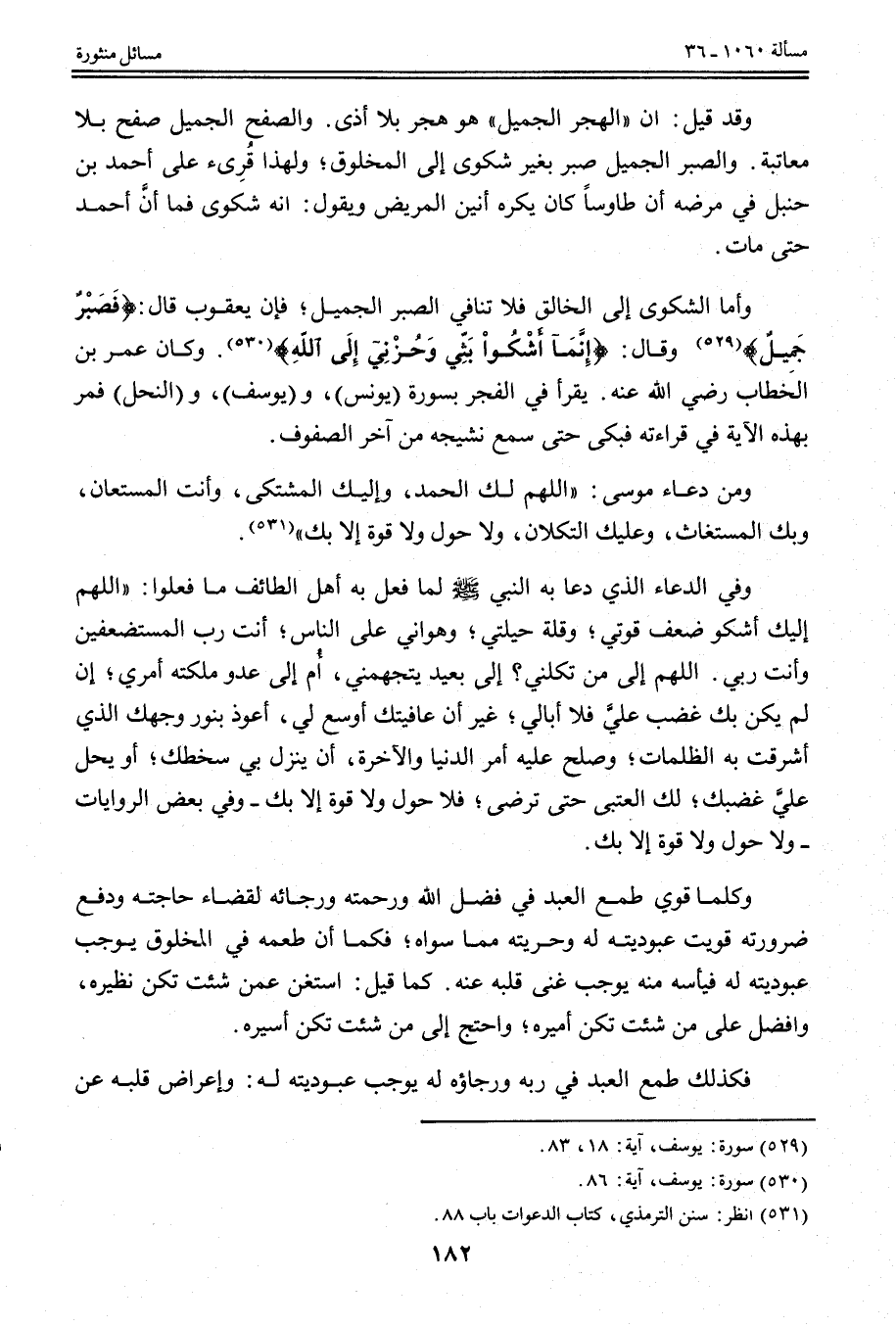 وَفِي الدُّعَاءِ الَّذِي دَعَا بِهِ النَّبِيُّ لَمَّا فَعَلَ بِهِ أَهْلُ الطَّائِفِ مَا فَعَلُوا: «اللَّهُمَّ إلَيْك أَشْكُو ضَعْفَ قُوَّتِي؛ وَقِلَّةَ حِيلَتِي؛ وَهَوَانِي عَلَى النَّاسِ؛ أَنْتَ رَبُّ الْمُسْتَضْعَفِينَ وَأَنْتَ رَبِّي. اللَّهُمَّ إلَى مَنْ تَكِلُنِي؟ إلَى بَعِيدٍ يَتَجَهَّمُنِي، أَمْ إلَى عَدُوٍّ مَلَّكْته أَمْرِي؛ إنْ لَمْ يَكُنْ بِك غَضَبٌ عَلَيَّ فَلَا أُبَالِي؛ غَيْرَ أَنَّ عَافِيَتَك أَوْسَعُ لِي، أَعُوذُ بِنُورِ وَجْهِك الَّذِي أَشْرَقَتْ بِهِ الظُّلُمَاتُ؛ وَصَلَحَ عَلَيْهِ أَمْرُ الدُّنْيَا وَالْآخِرَةِ، أَنْ يَنْزِلَ بِي سَخَطُك؛ أَوْ يَحِلَّ عَلَيَّ غَضَبُك؛ لَك الْعُتْبَى حَتَّى تَرْضَى؛ فَلَا حَوْلَ وَلَا قُوَّةَ إلَّا بِك» - وَفِي بَعْضِ الرِّوَايَاتِ - «وَلَا حَوْلَ وَلَا قُوَّةَ إلَّا بِك» .