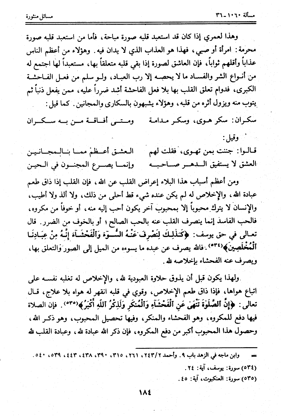 قَالَ تَعَالَى فِي حَقِّ يُوسُفَ: {كَذَلِكَ لِنَصْرِفَ عَنْهُ السُّوءَ وَالْفَحْشَاءَ إِنَّهُ مِنْ عِبَادِنَا الْمُخْلَصِينَ} [يوسف: 24] ، فَاَللَّهُ يَصْرِفُ عَنْ عَبْدِهِ مَا يَسُوءُهُ مِنْ الْمَيْلِ إلَى الصُّوَرِ وَالتَّعَلُّقِ بِهَا، وَيَصْرِفُ عَنْهُ الْفَحْشَاءَ بِإِخْلَاصِهِ لِلَّهِ.