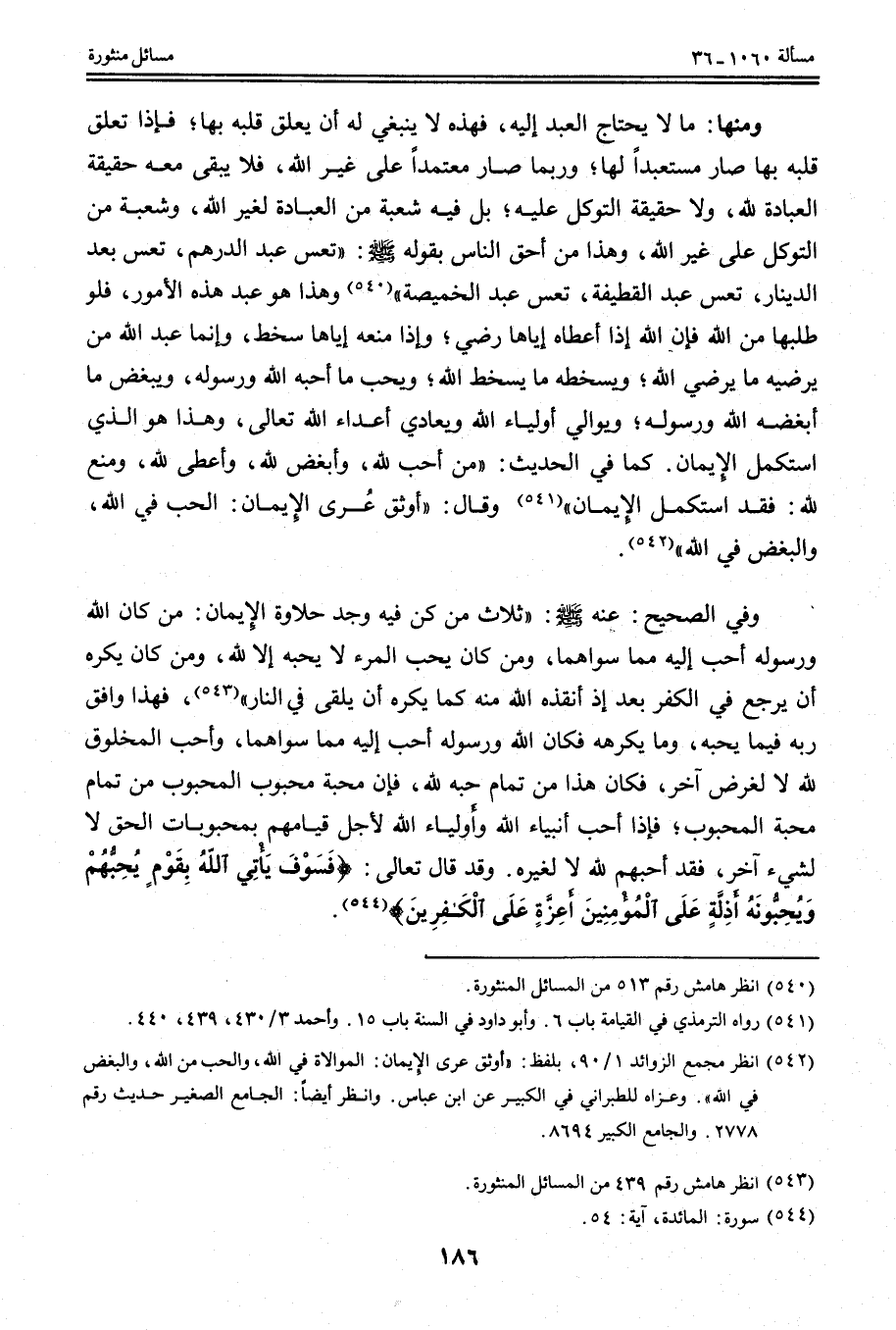 وَمِنْهَا: مَا لَا يَحْتَاجُ الْعَبْدُ إلَيْهِ، فَهَذِهِ لَا يَنْبَغِي لَهُ أَنْ يُعَلِّقَ قَلْبَهُ بِهَا؛ فَإِذَا تَعَلَّقَ قَلْبُهُ بِهَا صَارَ مُسْتَعْبَدًا لَهَا؛ وَرُبَّمَا صَارَ مُعْتَمِدًا عَلَى غَيْرِ اللَّهِ، فَلَا يَبْقَى مَعَهُ حَقِيقَةُ الْعِبَادَةِ لِلَّهِ، وَلَا حَقِيقَةُ التَّوَكُّلِ عَلَيْهِ؛ بَلْ فِيهِ شُعْبَةٌ مِنْ الْعِبَادَةِ لِغَيْرِ اللَّهِ، وَشُعْبَةٌ مِنْ التَّوَكُّلِ عَلَى غَيْرِ اللَّهِ، وَهَذَا مِنْ أَحَقِّ النَّاسِ بِقَوْلِهِ - صَلَّى اللَّهُ عَلَيْهِ وَسَلَّمَ -: «تَعِسَ عَبْدُ الدِّرْهَمِ، تَعِسَ عَبْدُ الدِّينَارِ، تَعِسَ عَبْدُ الْقَطِيفَةِ، تَعِسَ عَبْدُ الْخَمِيصَةِ» وَهَذَا هُوَ عَبْدُ هَذِهِ الْأُمُورِ، فَلَوْ طَلَبَهَا مِنْ اللَّهِ فَإِنَّ اللَّهَ إذَا أَعْطَاهُ إيَّاهَا رَضِيَ؛ وَإِذَا مَنَعَهُ إيَّاهَا سَخِطَ، وَإِنَّمَا عَبْدُ اللَّهِ مَنْ يُرْضِيهِ مَا يُرْضِي اللَّهَ؛ وَيُسْخِطُهُ مَا يُسْخِطُ اللَّهَ؛ وَيُحِبُّ مَا أَحَبَّهُ اللَّهُ وَرَسُولُهُ، وَيَبْغُضُ مَا أَبْغَضَهُ اللَّهُ وَرَسُولُهُ؛ وَيُوَالِي أَوْلِيَاءَ اللَّهِ وَيُعَادِي أَعْدَاءَ اللَّهِ تَعَالَى، وَهَذَا هُوَ الَّذِي اسْتَكْمَلَ الْإِيمَانَ.