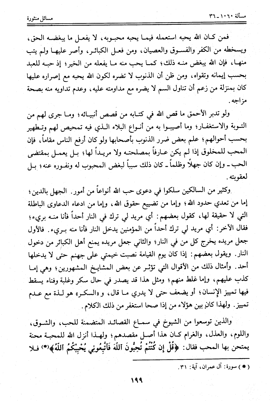 وَكَثِيرٌ مِنْ السَّالِكِينَ سَلَكُوا فِي دَعْوَى حُبِّ اللَّهِ أَنْوَاعًا مِنْ أُمُورِ الْجَهْلِ بِالدِّينِ؛ إمَّا مِنْ تَعَدِّي حُدُودِ اللَّهِ؛ وَإِمَّا مِنْ تَضْيِيعِ حُقُوقِ اللَّهِ، وَإِمَّا مِنْ ادِّعَاءِ الدَّعَاوَى الْبَاطِلَةِ الَّتِي لَا حَقِيقَةَ لَهَا، كَقَوْلِ بَعْضِهِمْ: أَيُّ مُرِيدٍ لِي تَرَكَ فِي النَّارِ أَحَدًا فَأَنَا مِنْهُ بَرِيءٌ؛ فَقَالَ الْآخَرُ: أَيُّ مُرِيدٍ لِي تَرَكَ أَحَدًا مِنْ الْمُؤْمِنِينَ يَدْخُلُ النَّارَ فَأَنَا مِنْهُ بَرِيءٌ.