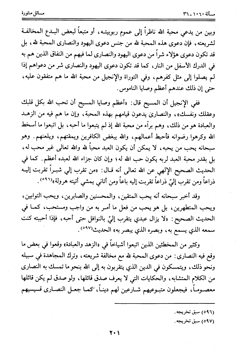 وَبَيْنَ مَنْ يَدَّعِي مَحَبَّةَ اللَّهِ نَاظِرًا إلَى عُمُومِ رُبُوبِيَّتِهِ، أَوْ مُتَّبِعًا لِبَعْضِ الْبِدَعِ الْمُخَالِفَةِ لِشَرِيعَتِهِ، فَإِنَّ دَعْوَى هَذِهِ الْمَحَبَّةِ لِلَّهِ مِنْ جِنْسِ دَعْوَى الْيَهُودِ وَالنَّصَارَى الْمَحَبَّةَ لِلَّهِ، بَلْ قَدْ تَكُونُ دَعْوَى هَؤُلَاءِ شَرًّا مِنْ دَعْوَى الْيَهُودِ وَالنَّصَارَى لِمَا فِيهِمْ مِنْ النِّفَاقِ الَّذِينَ هُمْ بِهِ فِي الدَّرْكِ الْأَسْفَلِ مِنْ النَّارِ، كَمَا قَدْ تَكُونُ دَعْوَى الْيَهُودِ وَالنَّصَارَى شَرٌّ مِنْ دَعْوَاهُمْ إذَا لَمْ يَصِلُوا إلَى مِثْلِ كُفْرِهِمْ، وَفِي التَّوْرَاةِ وَالْإِنْجِيلِ مِنْ مَحَبَّةِ اللَّهِ مَا هُمْ مُتَّفِقُونَ عَلَيْهِ، حَتَّى إنَّ ذَلِكَ عِنْدَهُمْ أَعْظَمُ وَصَايَا النَّامُوسِ.