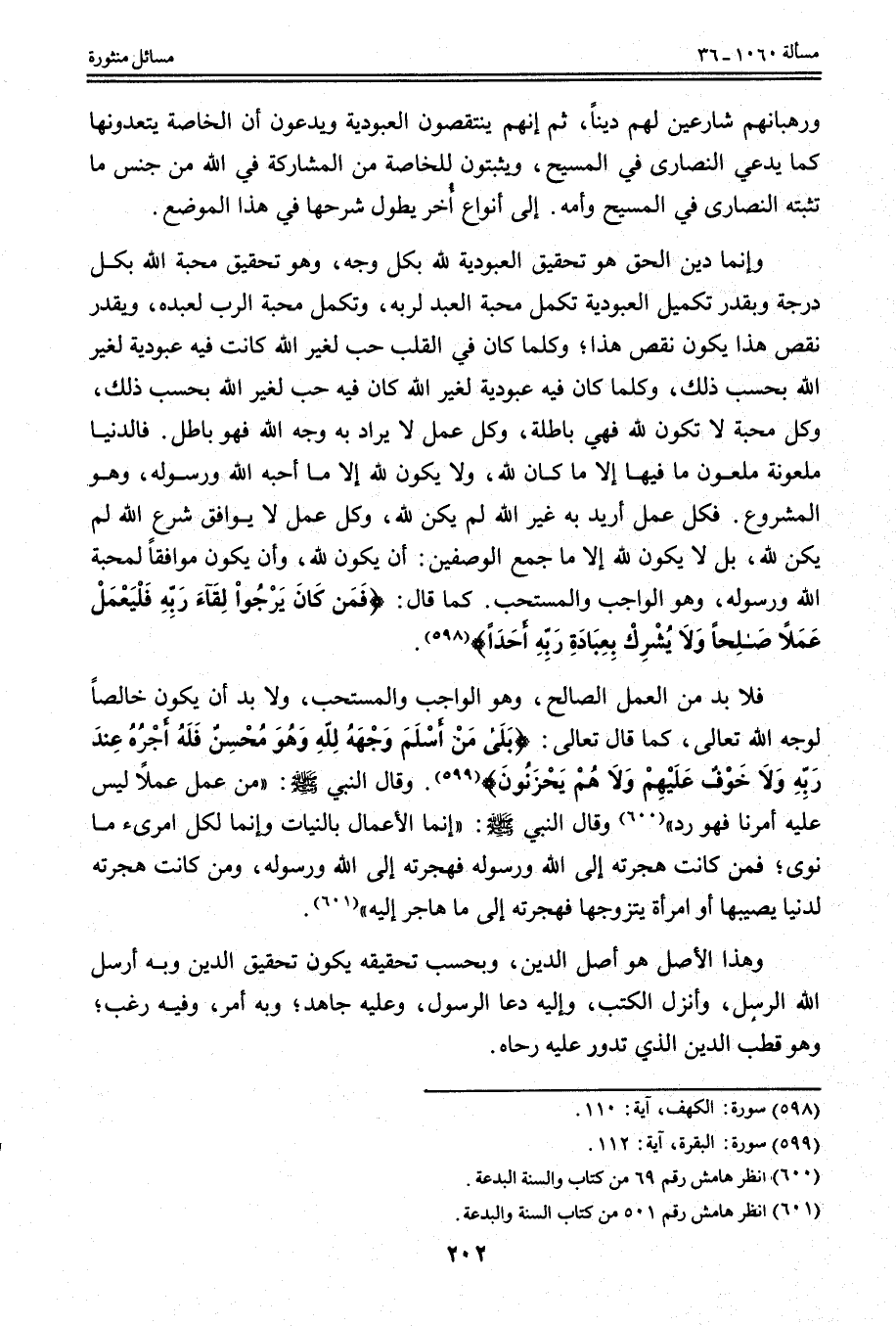 وَإِنَّمَا دِينُ الْحَقِّ هُوَ تَحْقِيقُ الْعُبُودِيَّةِ لِلَّهِ بِكُلِّ وَجْهٍ، وَهُوَ تَحْقِيقُ مَحَبَّةِ اللَّهِ بِكُلِّ دَرَجَةٍ وَبِقَدْرِ تَكْمِيلِ الْعُبُودِيَّةِ تَكْمُلُ مَحَبَّةُ الْعَبْدِ لِرَبِّهِ، وَتَكْمُلُ مَحَبَّةُ الرَّبِّ لِعَبْدِهِ، وَبِقَدْرِ نَقْصِ هَذَا يَكُونُ نَقْصُ هَذَا؛ وَكُلَّمَا كَانَ فِي الْقَلْبِ حُبٌّ لِغَيْرِ اللَّهِ كَانَتْ فِيهِ عُبُودِيَّةٌ لِغَيْرِ اللَّهِ بِحَسَبِ ذَلِكَ، وَكُلَّمَا كَانَ فِيهِ عُبُودِيَّةٌ لِغَيْرِ اللَّهِ كَانَ فِيهِ حُبٌّ لِغَيْرِ اللَّهِ بِحَسَبِ ذَلِكَ، وَكُلُّ مَحَبَّةٍ لَا تَكُونُ لِلَّهِ فَهِيَ بَاطِلَةٌ، وَكُلُّ عَمَلٍ لَا يُرَادُ بِهِ وَجْهُ اللَّهِ فَهُوَ بَاطِلٌ.