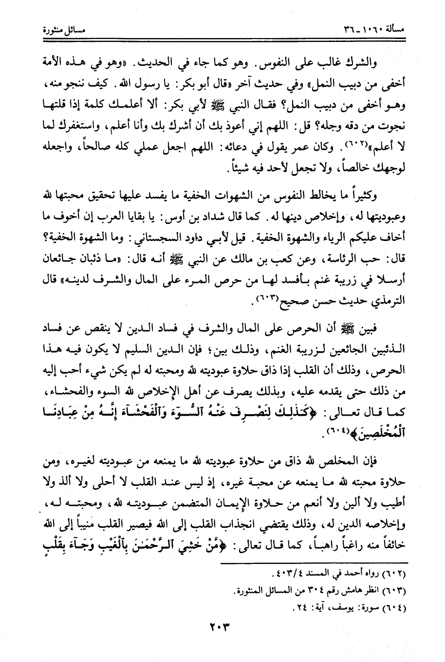 فَبَيَّنَ - صَلَّى اللَّهُ عَلَيْهِ وَسَلَّمَ - أَنَّ الْحِرْصَ عَلَى الْمَالِ وَالشَّرَفِ فِي فَسَادِ الدِّينِ لَا يَنْقُصُ عَنْ فَسَادِ الذِّئْبَيْنِ الْجَائِعَيْنِ لِزَرِيبَةِ الْغَنَمِ، وَذَلِكَ بَيِّنٌ؛ فَإِنَّ الدِّينَ السَّلِيمَ لَا يَكُونُ فِيهِ هَذَا الْحِرْصُ، وَذَلِكَ أَنَّ الْقَلْبَ إذَا ذَاقَ حَلَاوَةَ عُبُودِيَّتِهِ لِلَّهِ وَمَحَبَّتِهِ لَهُ لَمْ يَكُنْ شَيْءٌ أَحَبَّ إلَيْهِ مِنْ ذَلِكَ حَتَّى يُقَدِّمَهُ عَلَيْهِ، وَبِذَلِكَ يُصْرَفُ عَنْ أَهْلِ الْإِخْلَاصِ لِلَّهِ السُّوءُ وَالْفَحْشَاءُ، كَمَا قَالَ تَعَالَى: {كَذَلِكَ لِنَصْرِفَ عَنْهُ السُّوءَ وَالْفَحْشَاءَ إِنَّهُ مِنْ عِبَادِنَا الْمُخْلَصِينَ} [يوسف: 24] .